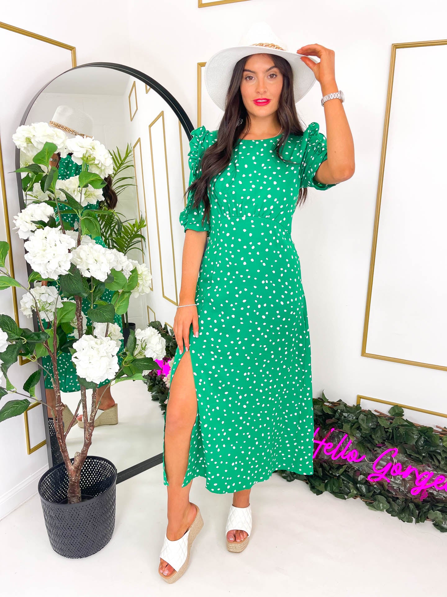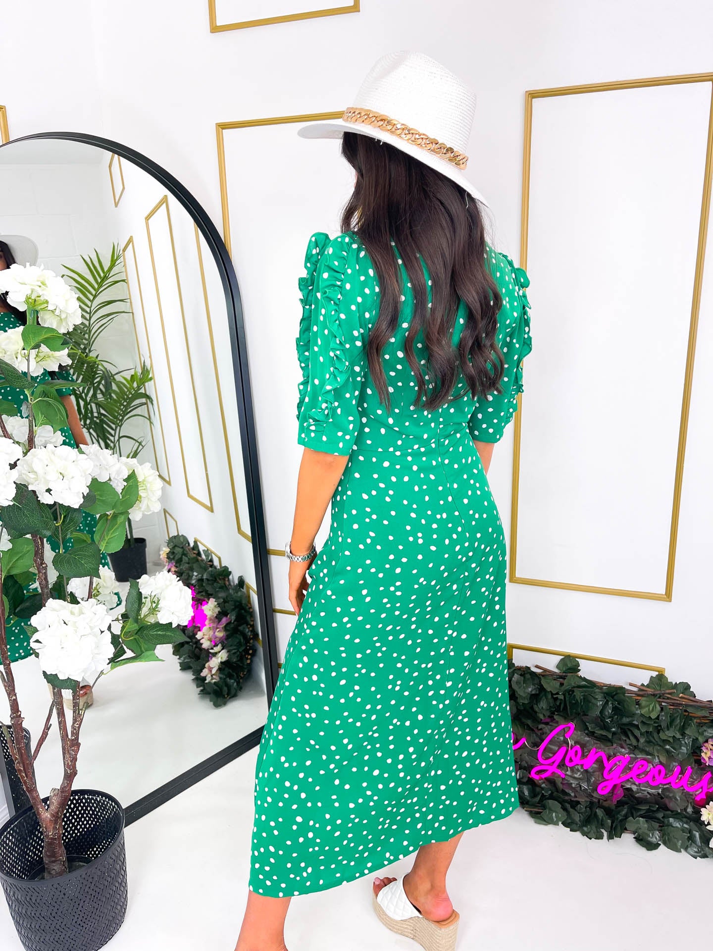 A stunning green polka dot midi dress featuring playful 3/4 frill sleeves and a flattering leg split. Perfect for adding a touch of vintage charm to your everyday wardrobe or special occasions.