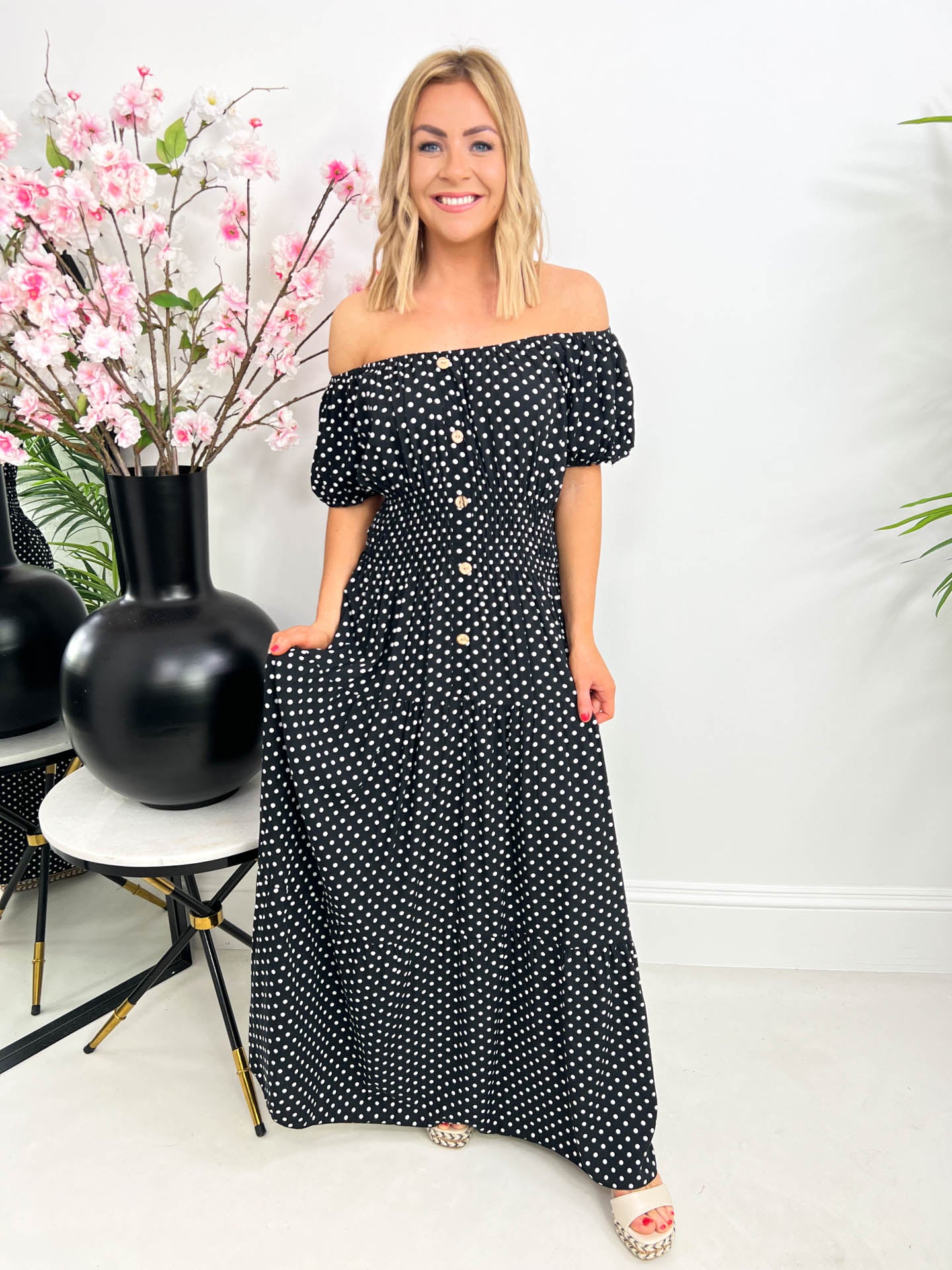 All About Me Our gorgeous Christy maxi dress is perfect for spring and summer, such a girly vibe! Featuring a bardot neckline with shirred detailing and buttons, we love!