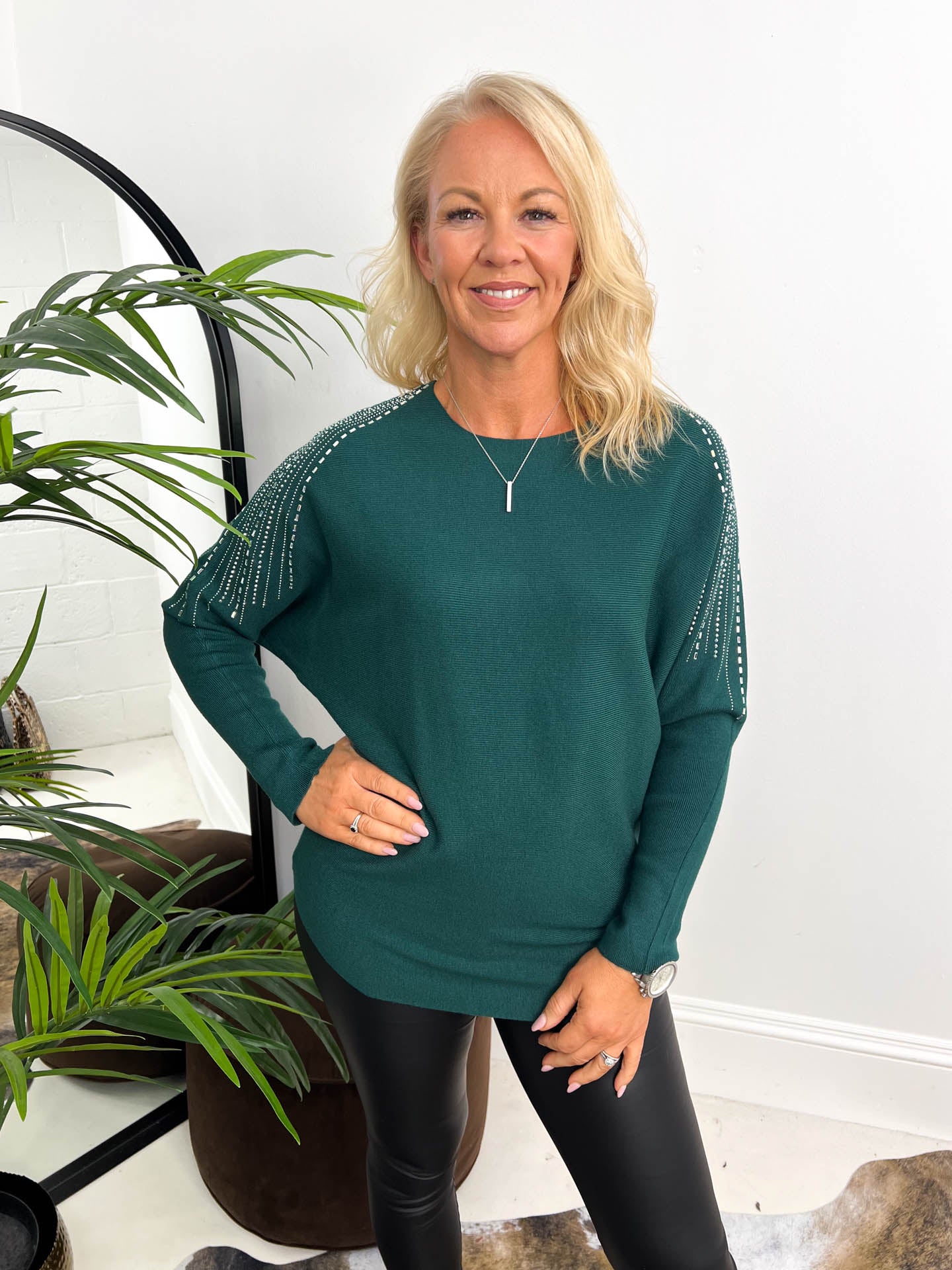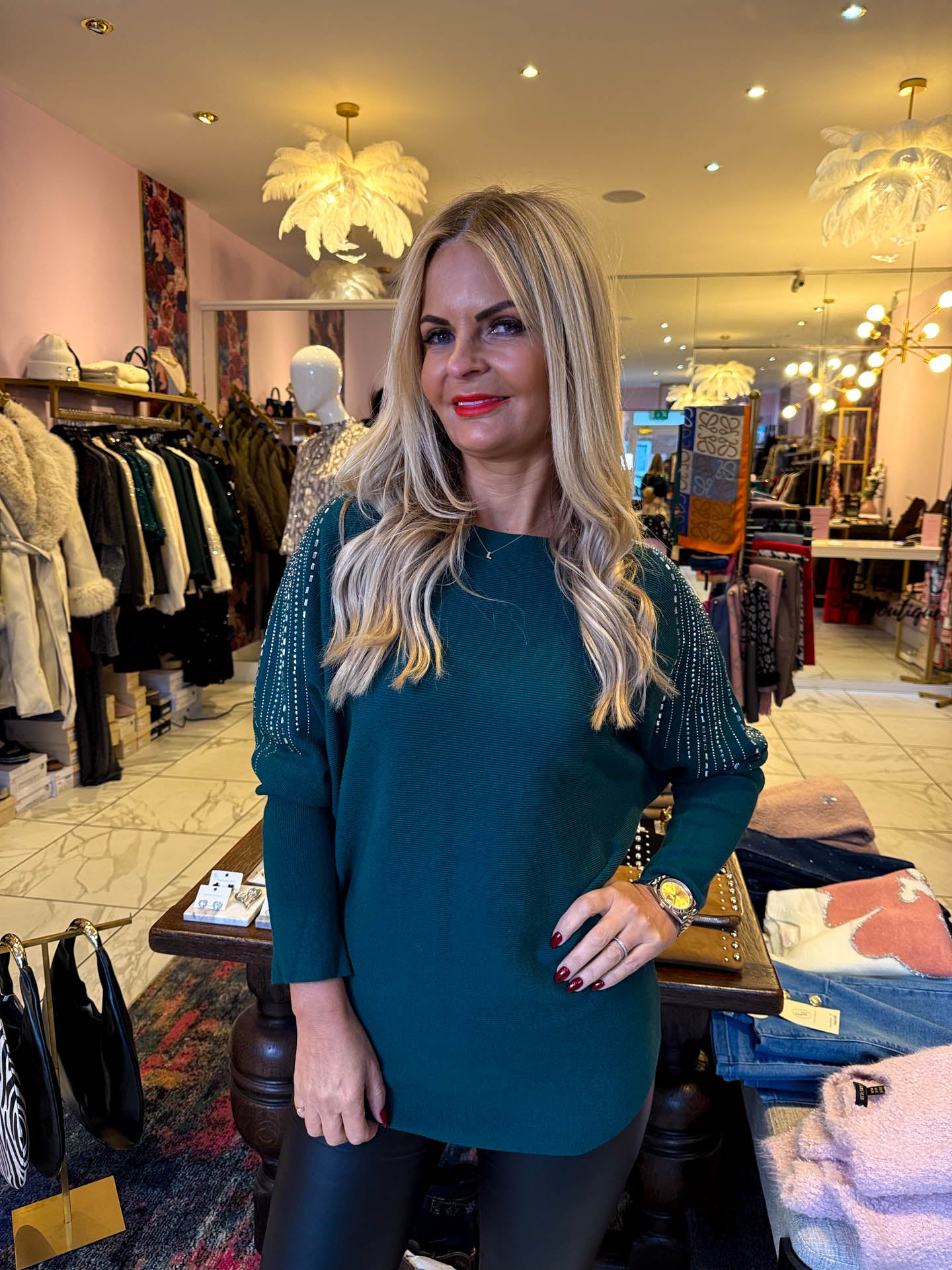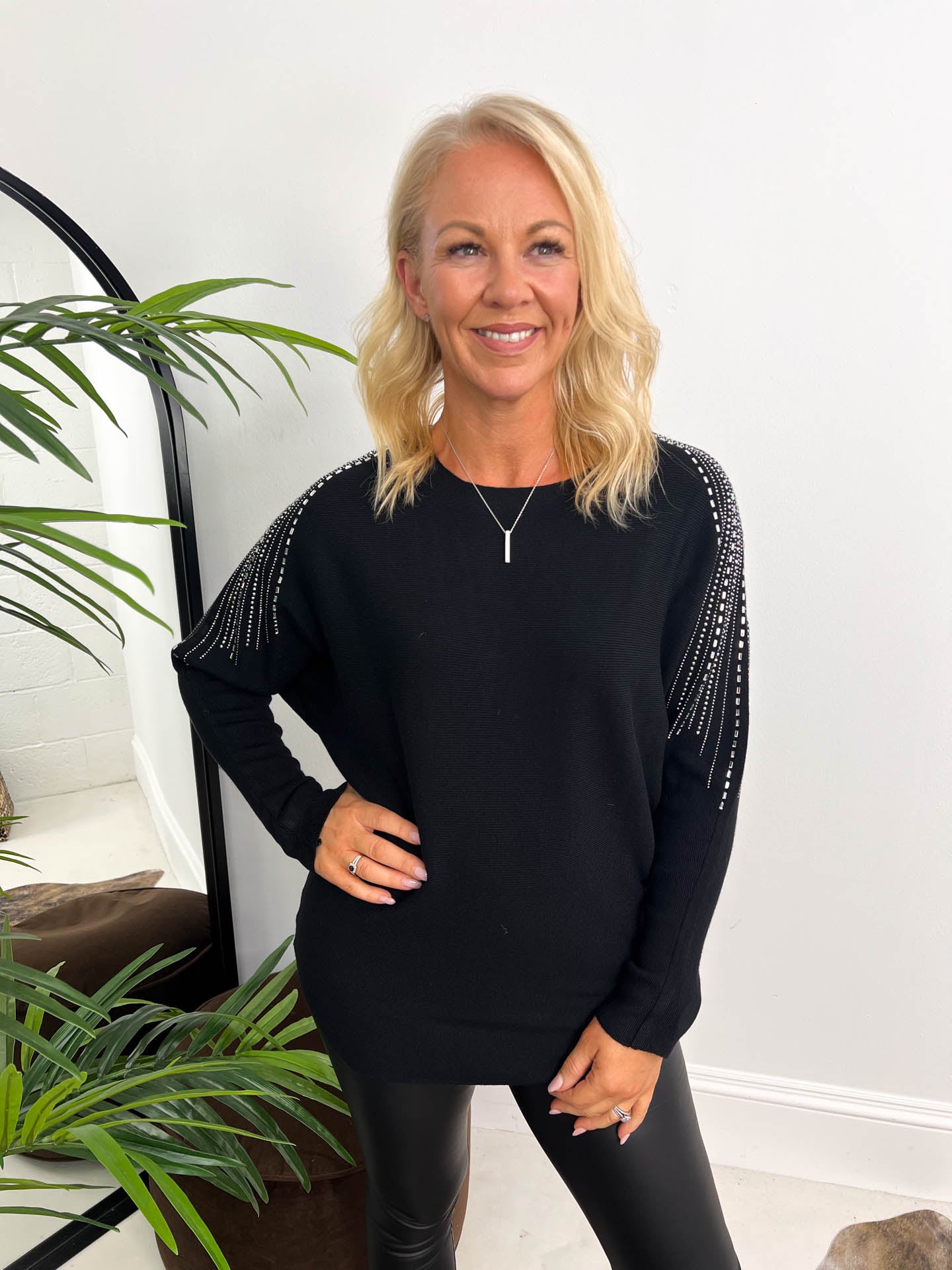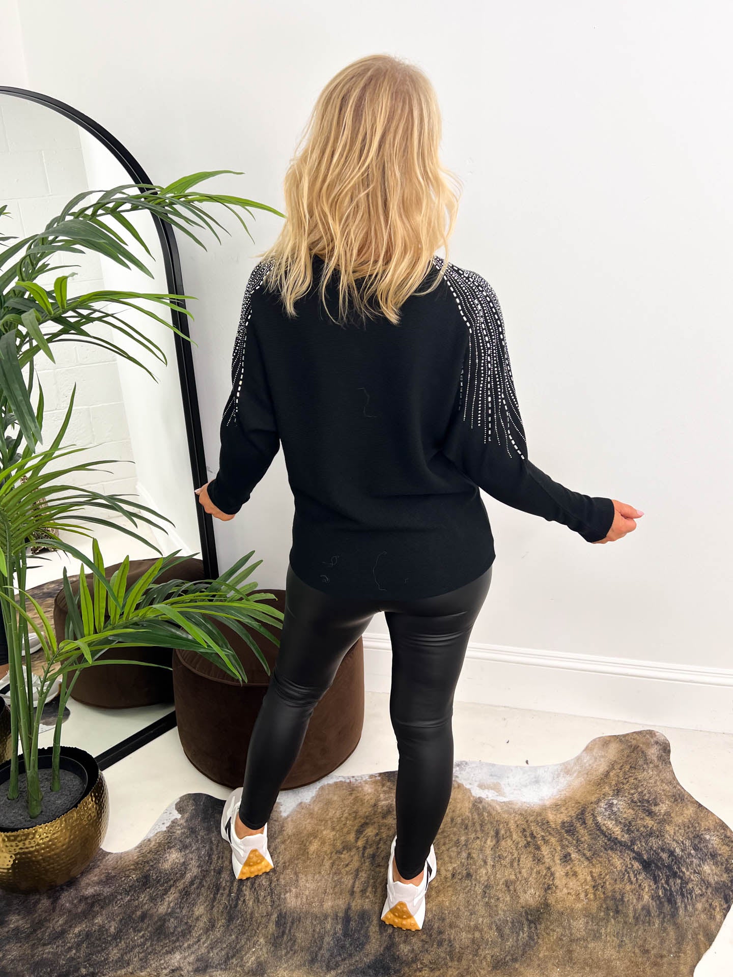 OMG how cute is our Alice Knit?! Coming in 4 stunning colours, this knit features striped diamanté detailing on both shoulders, and batwing sleeves with fitted cuffs. Perfect for dressing up, we've paired this with leather look leggings and trainers for a gorgeous girls day 'fit.