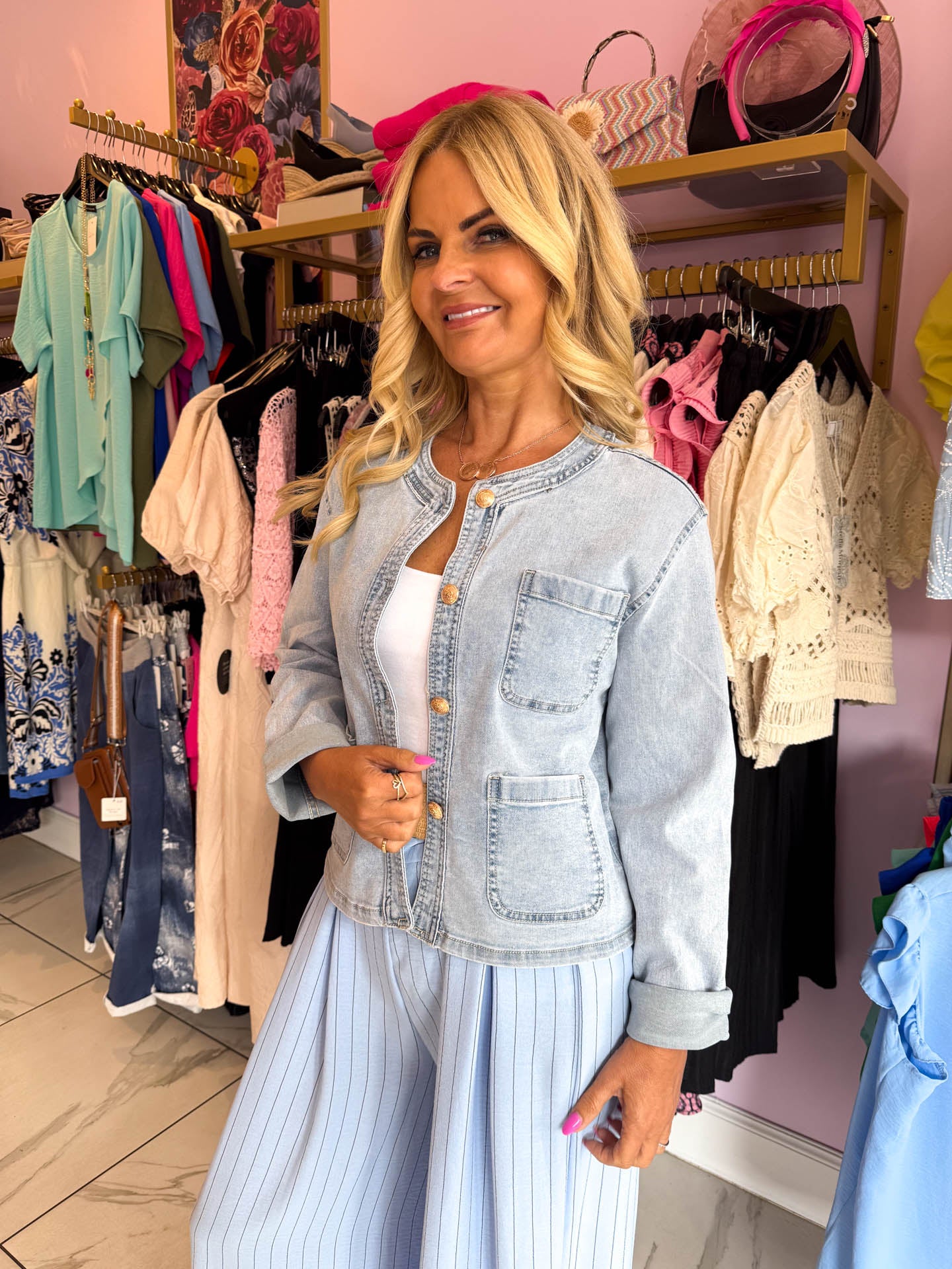 WOW how gorgeous is our Allegra Denim Jacket?! Featuring a scoop collarless design, pocket detailing and gold buttons, this jacket is the perfect summer cover up.
