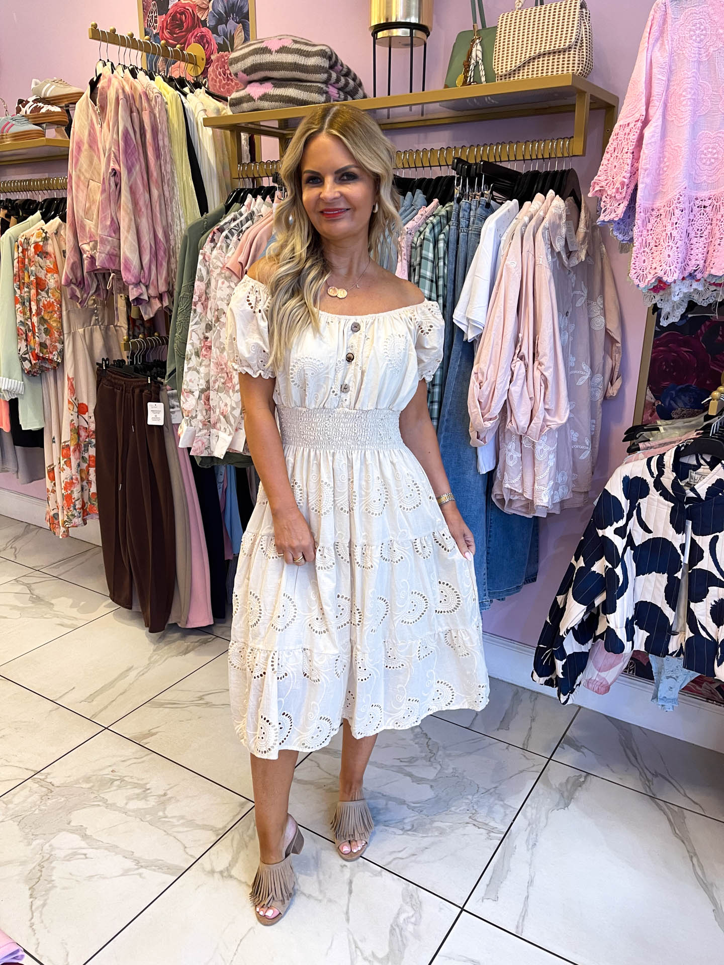This maxi dress showcases intricate broderie anglaise detailing throughout, complemented by charming puff sleeves and a cute button front. The fitted waist creates a flattering silhouette that keeps you comfy while looking gorgeous. Choose from seven beautiful colours to match your personal aesthetic and wardrobe needs.