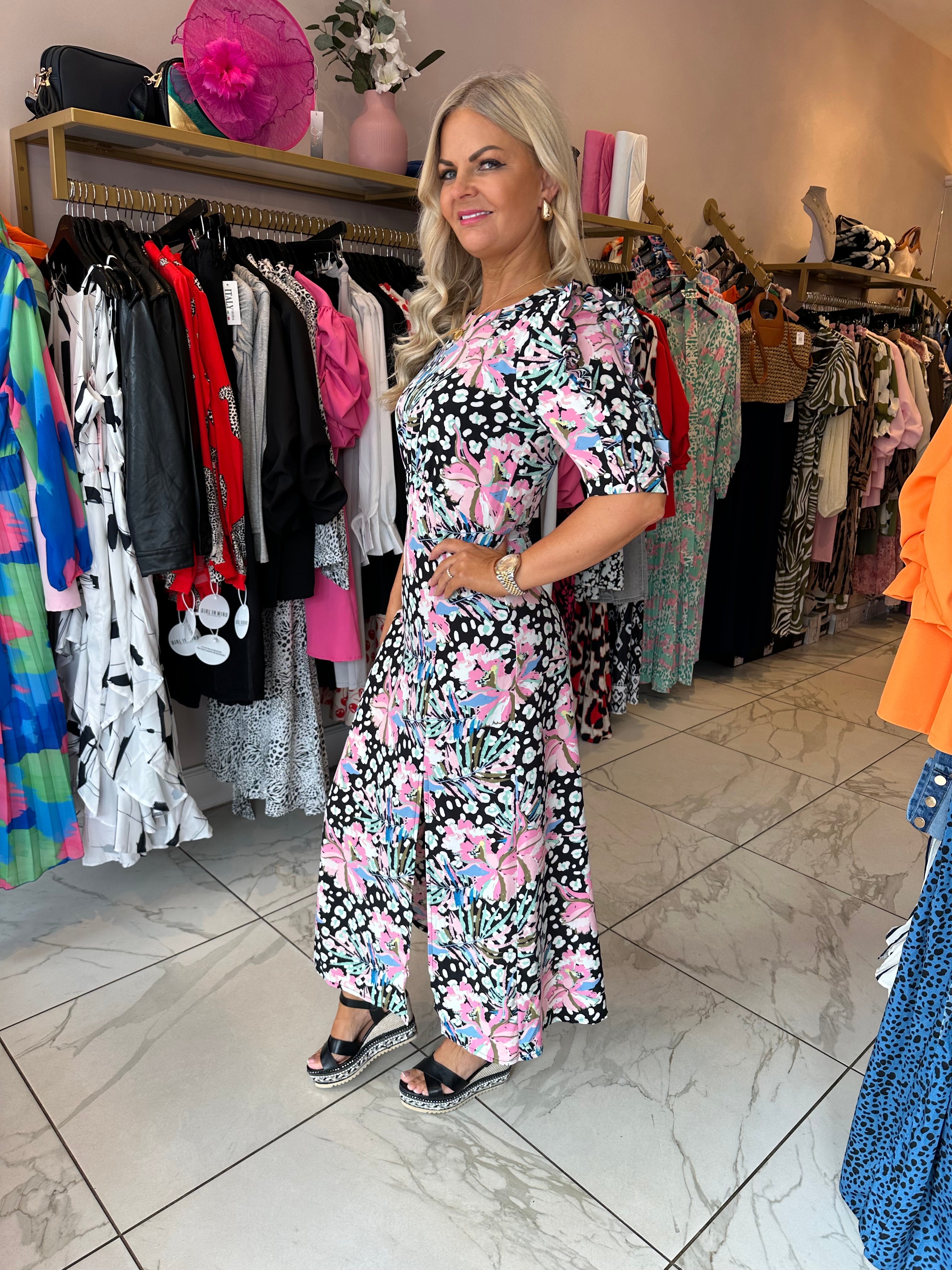 All About Me - Style it up this season with our gorgeous ANYA dress. Featuring a floral design, frill sleeves, midi fit with a thigh slit. Pair with strappy tie up heels.