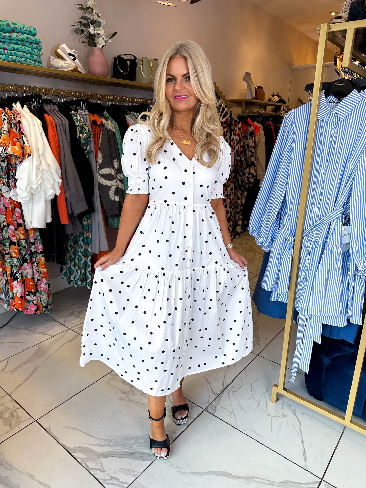 All About Me - The perfect spring dress is here! The Ariella dress has a long tiered style skirt, v-neckline and puffy sleeves. Pair this with our ashley denim jacket for a day out!
