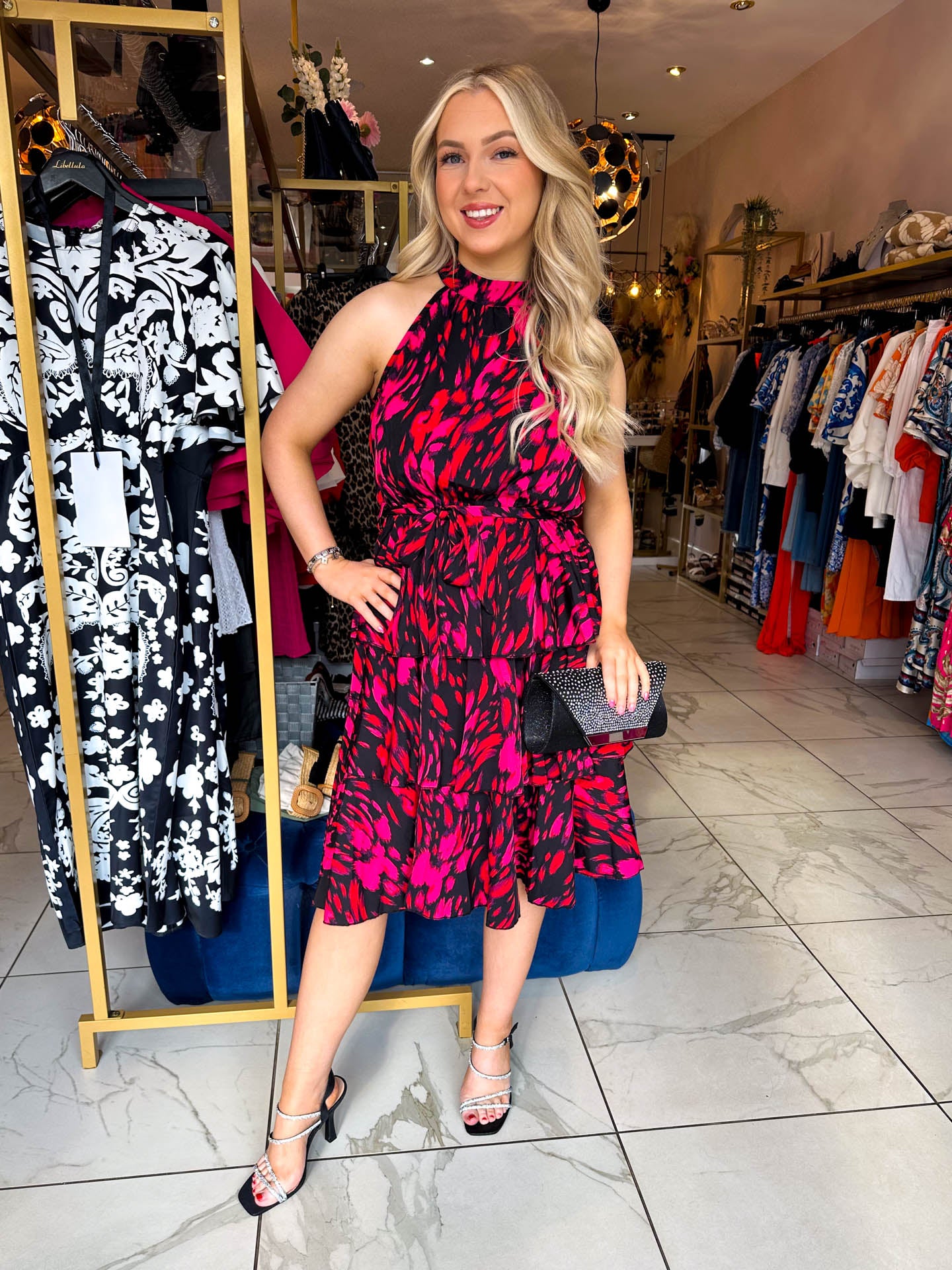 The Astrid midi dress is perfect for any occasion! Featuring a tieable waist, high neckline and abstract print. Style with wedges and a clutch to complete the look!