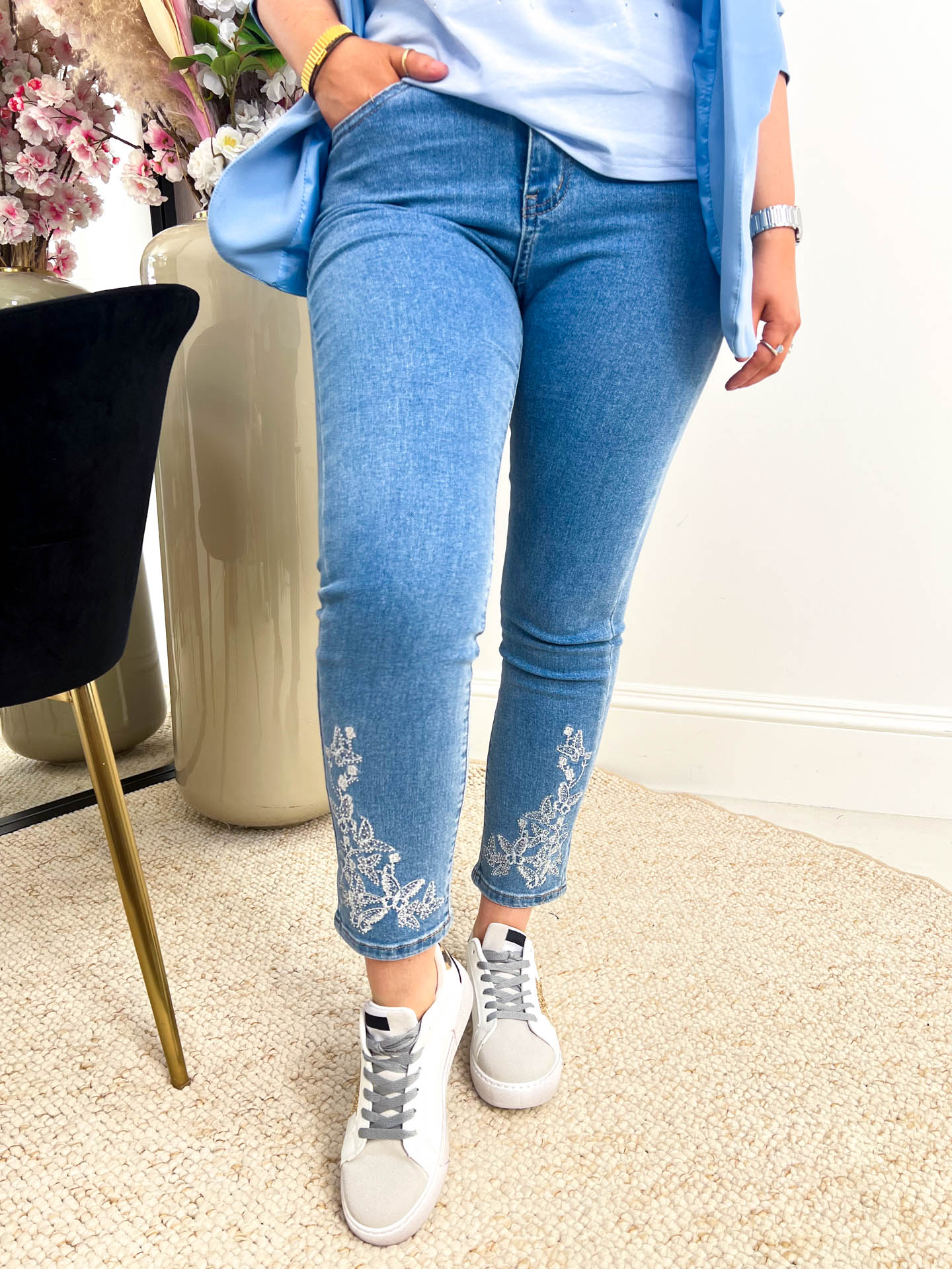 We love a bit of embellishment and the Bethan butterfly embroidered jeans add a little bit of something to your classic denims. These are a skinny jean in a mid blue wash, and we love that they have a bit of stretch so they are comfy.