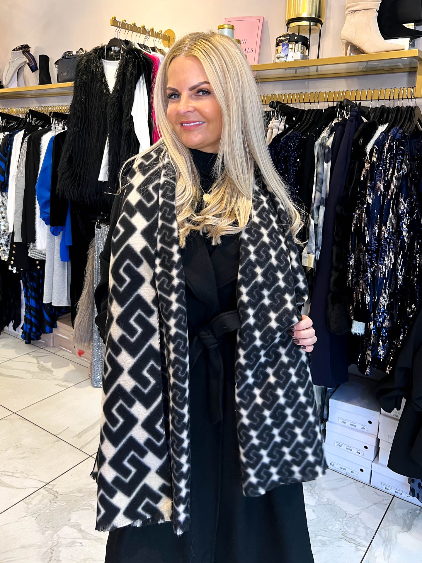 We love our Betty scarf featuring a stunning black and white pattern. Style our Betty scarf with a black outfit and a pir of boots.