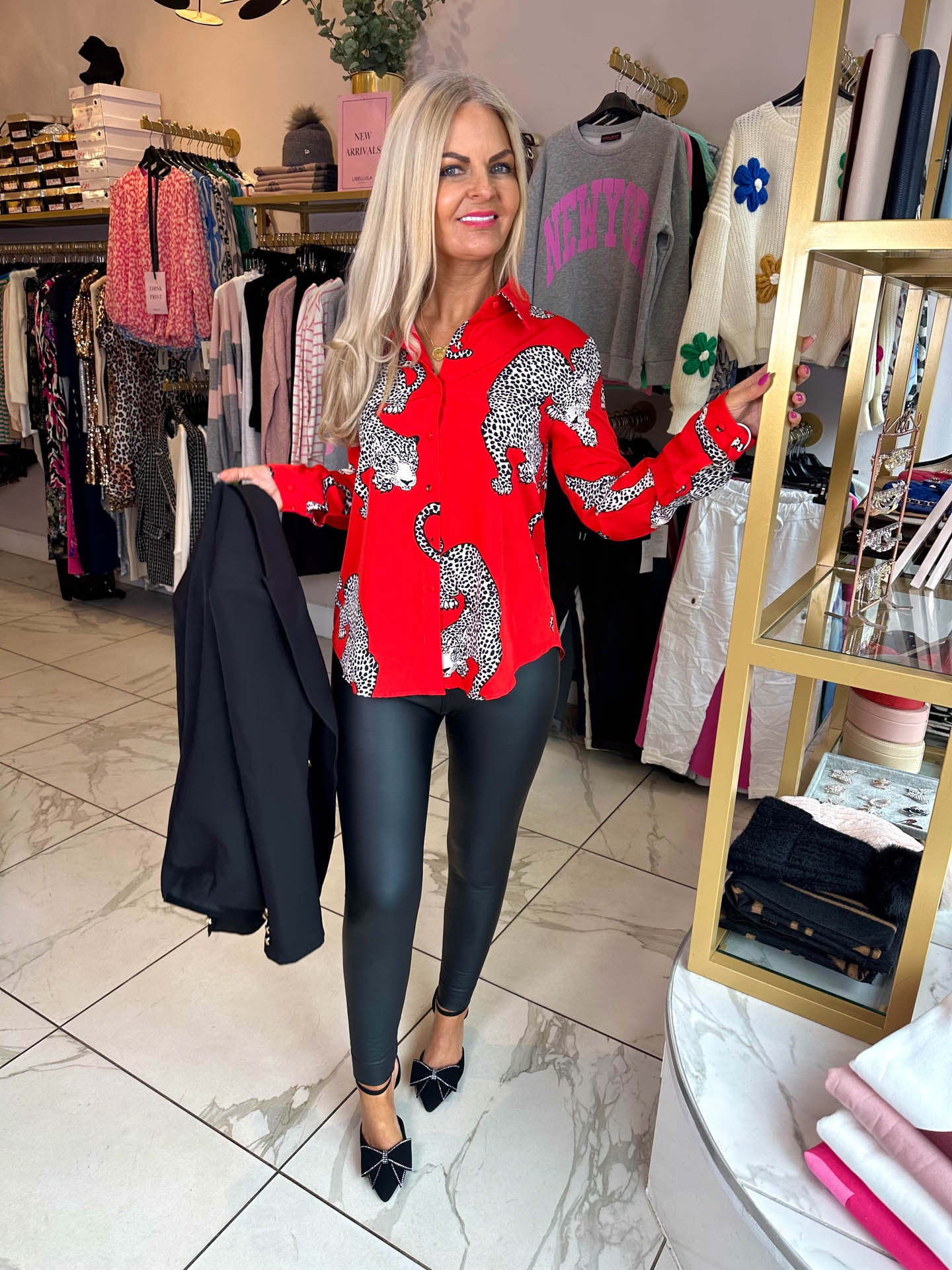 All About Me - How stylish is our new Brooke blouse? Elevate your style with this fierce red blouse with a leopard design. This top is not only a crowd pleaser, but is flowy and buttons up - making it super comfortable! Style with black jeans or Leather leggings to continue that fierce, stylish look.