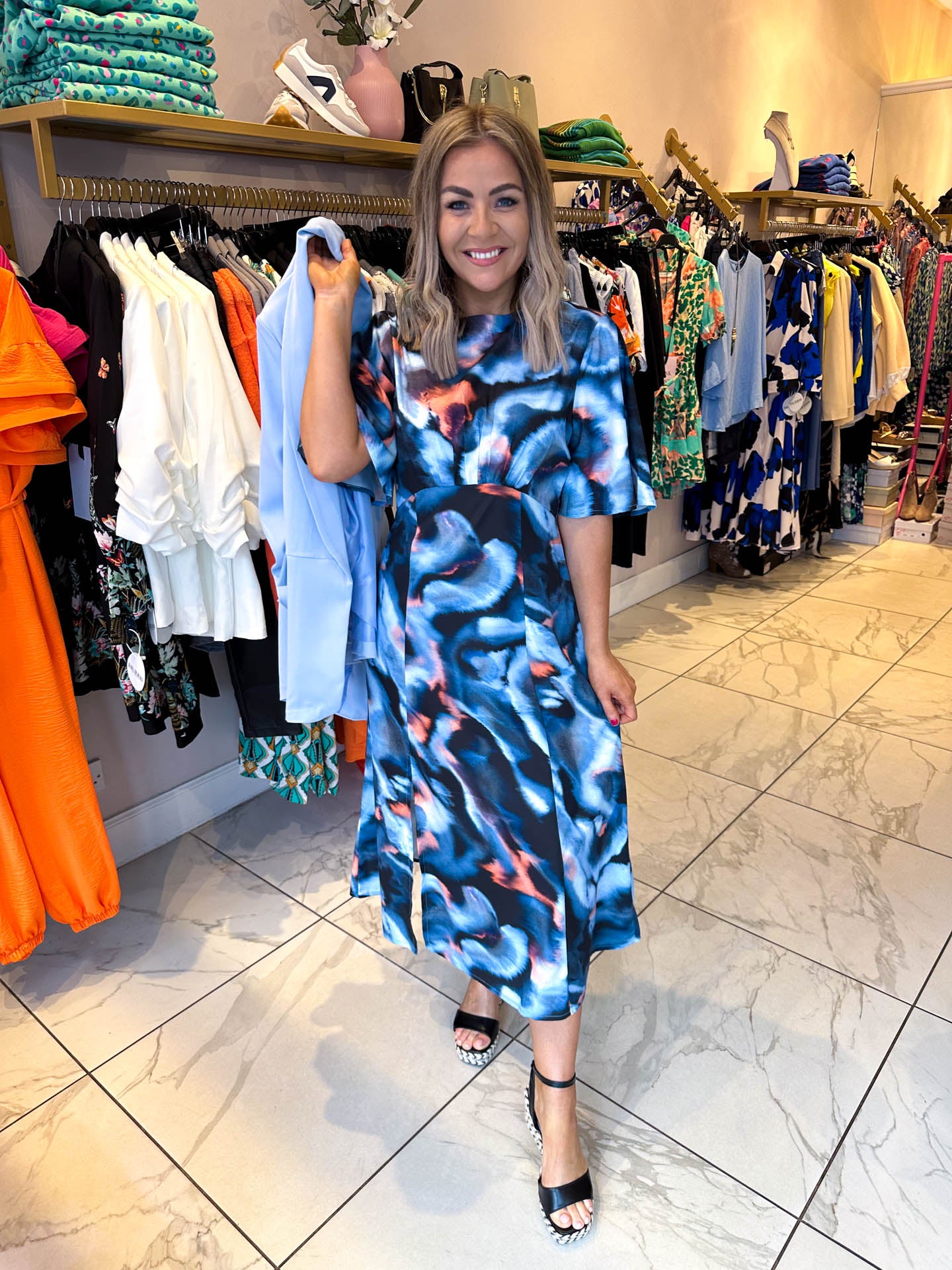 All About Me - Elevate your style with our gorgeous Brooklyn dress. Featuring a blue, black and orange design, this is the perfect transition dress from winter to spring.