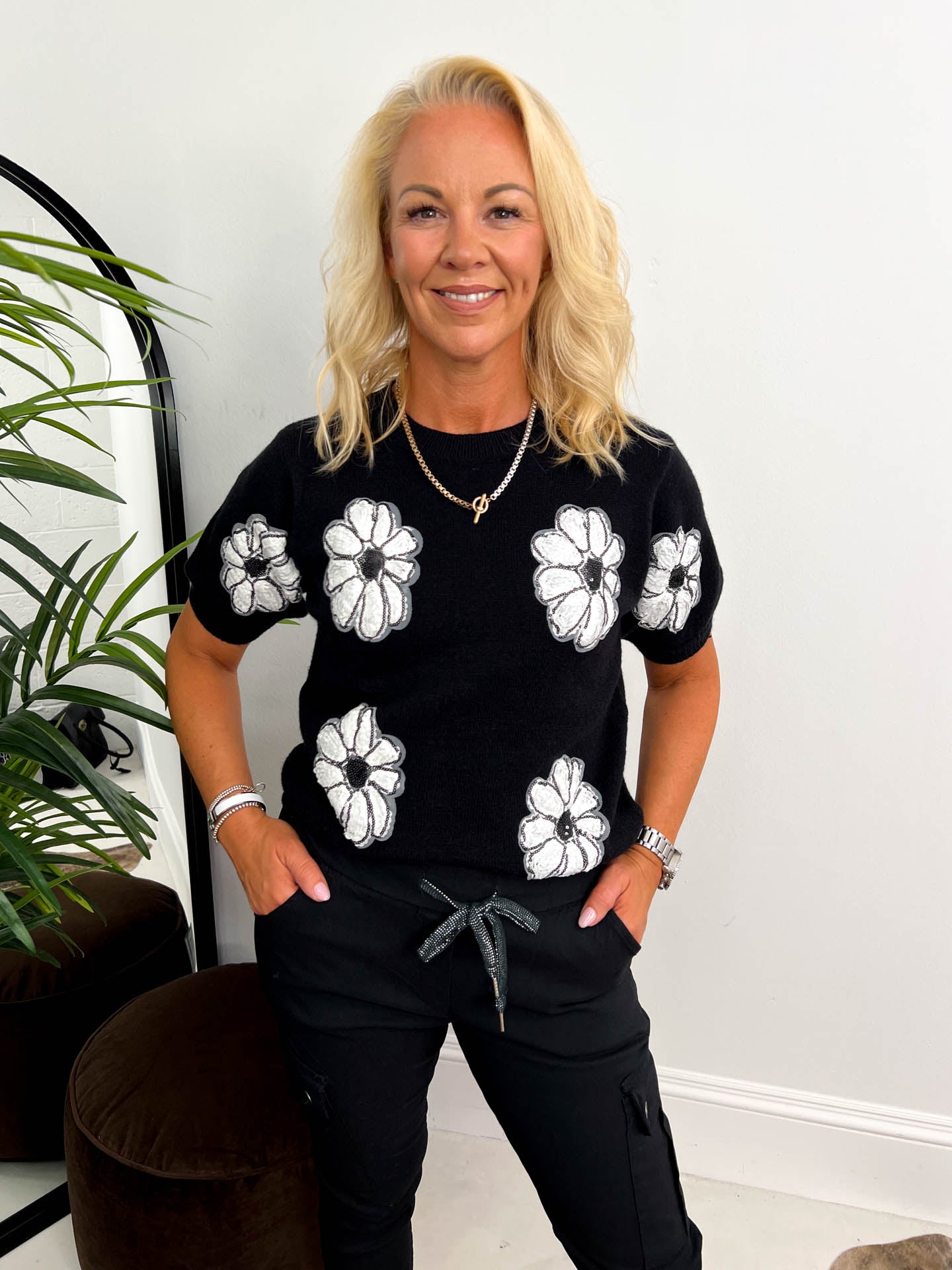 The Casey is a beautiful, short sleeve knit with intricate floral embroidery. This is a great piece for transitioning into spring/summer as it is a fine knit, not too heavy for heading into the new season. This would look gorgeous with a satin midi skirt for a dressier look, or a pair of our Farrah leggings for a casual lunch look.