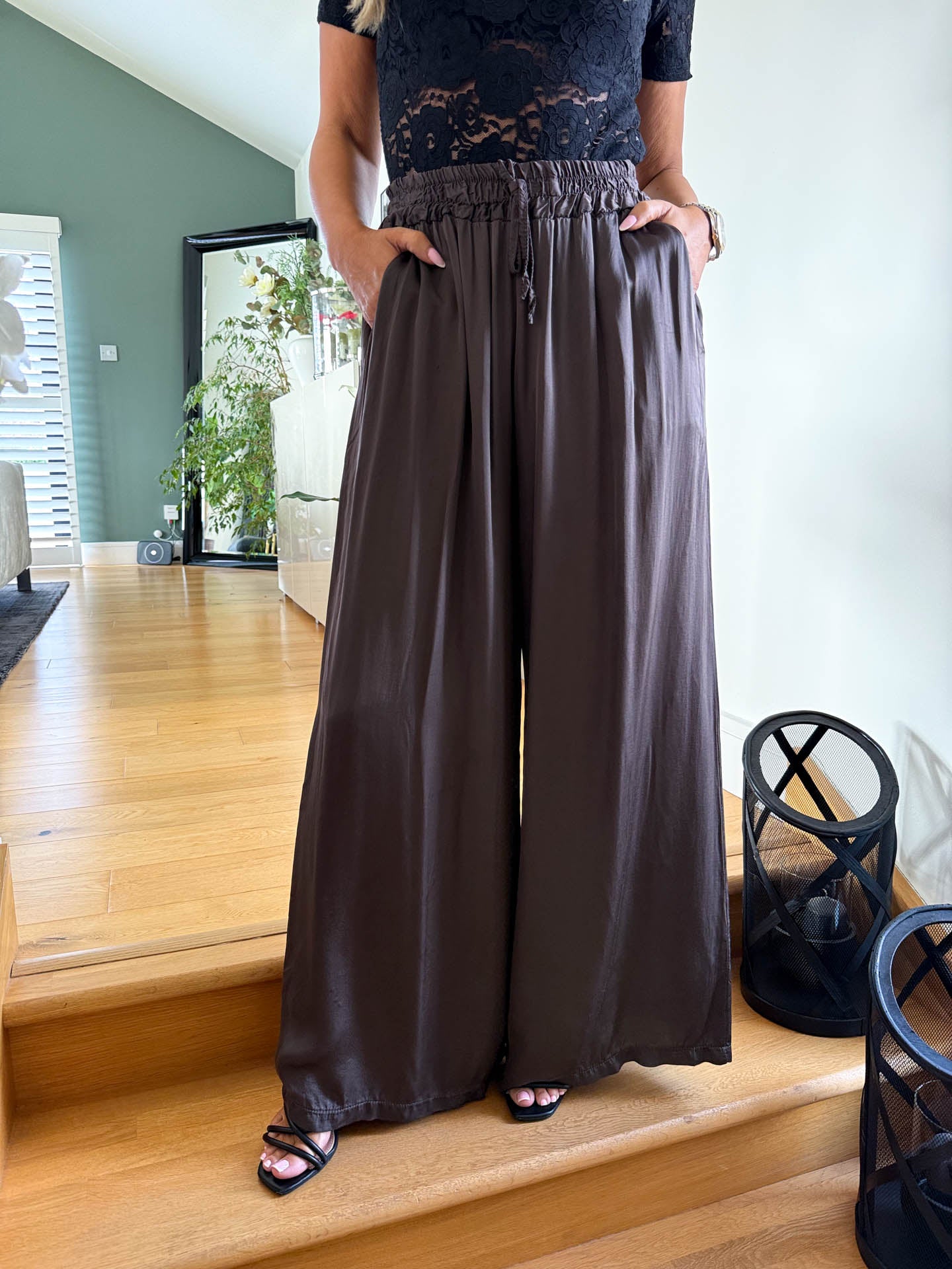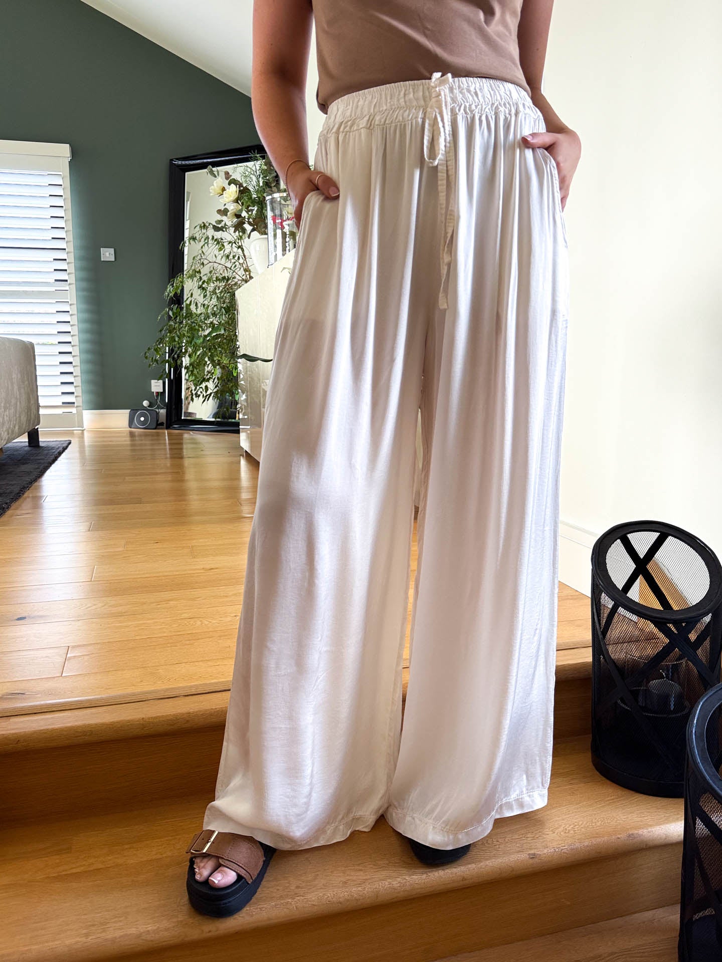 Slip into effortless elegance with The Celest satin feel trousers. Designed for warm weather comfort, these lightweight trousers feature a relaxed elasticated tie waist and practical front pockets for everyday convenience. The smooth, luxurious fabric drapes beautifully while keeping you cool and comfortable. Available in five colours to match your personal style.