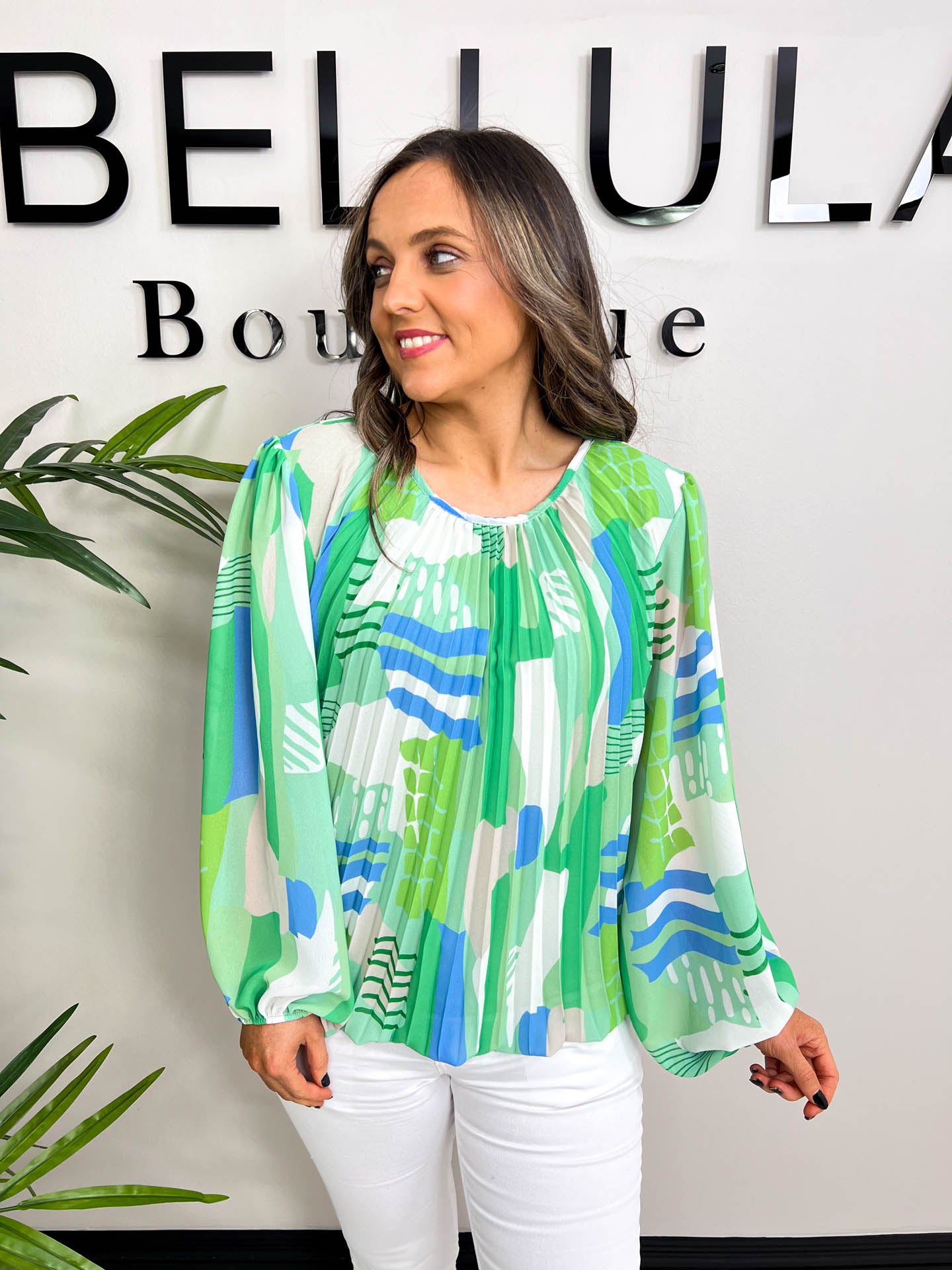 Prints and pattern are here to stay this Spring 2024! The Celeste has the perfect print and flattering pleats for 70’s inspired glamour! Available in 3 vibrant shades, all pair stylishly with The Nadia Flared Trouser or The Farrah Leggings