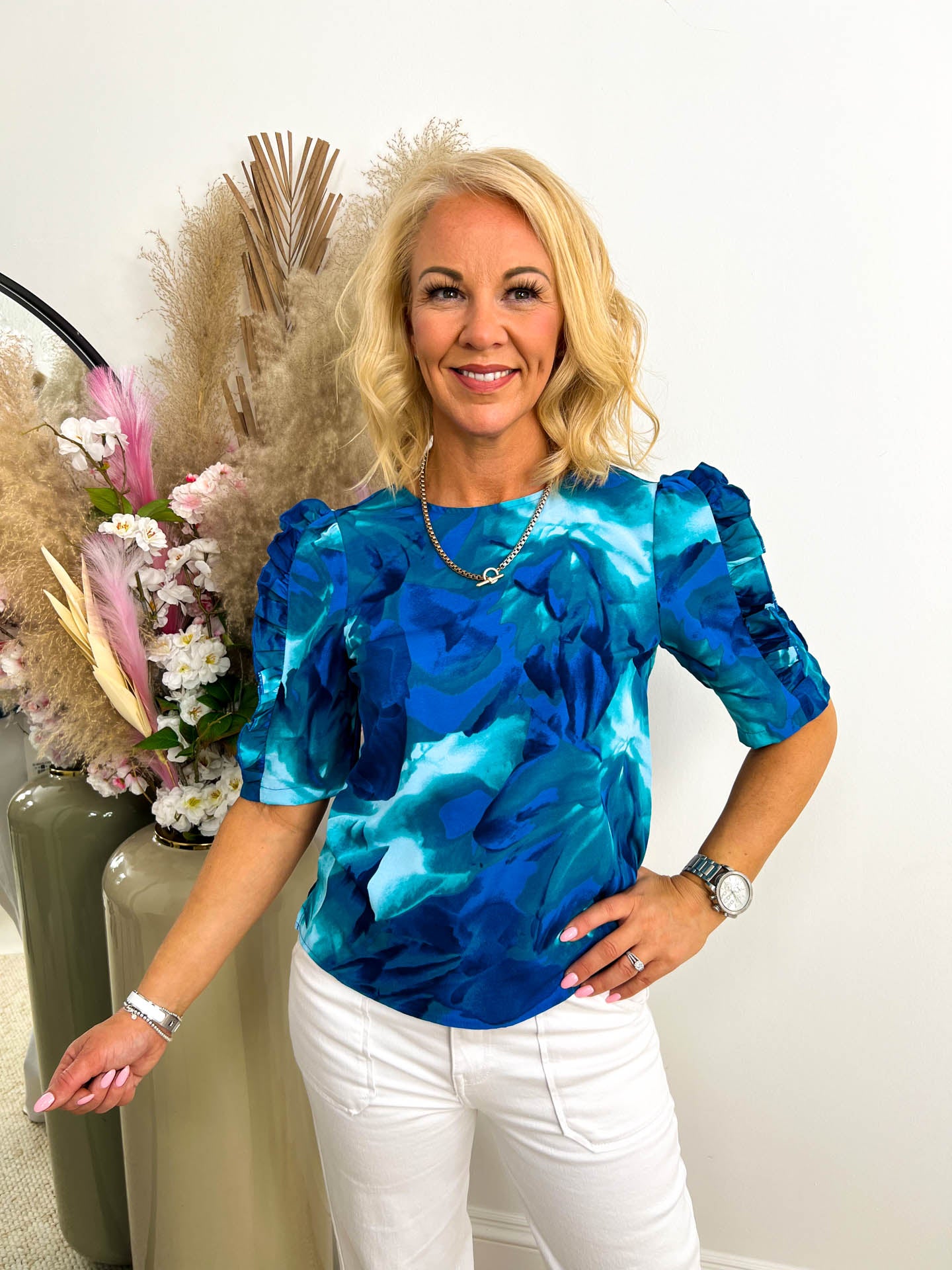 How cute and trendy is our Cerys Blue Floral Print Blouse?! Featuring a satin feel fabric and frill detailed sleeves. Style with some jeans and trainers to complete the look.