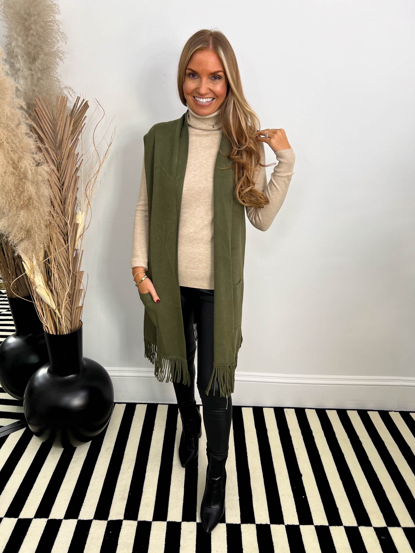 The Chloe is a gorgeous sleeveless cardigan with tassel detailing. It is perfect for wearing over The Farrah leathers and a roll neck for a cosy fall look.