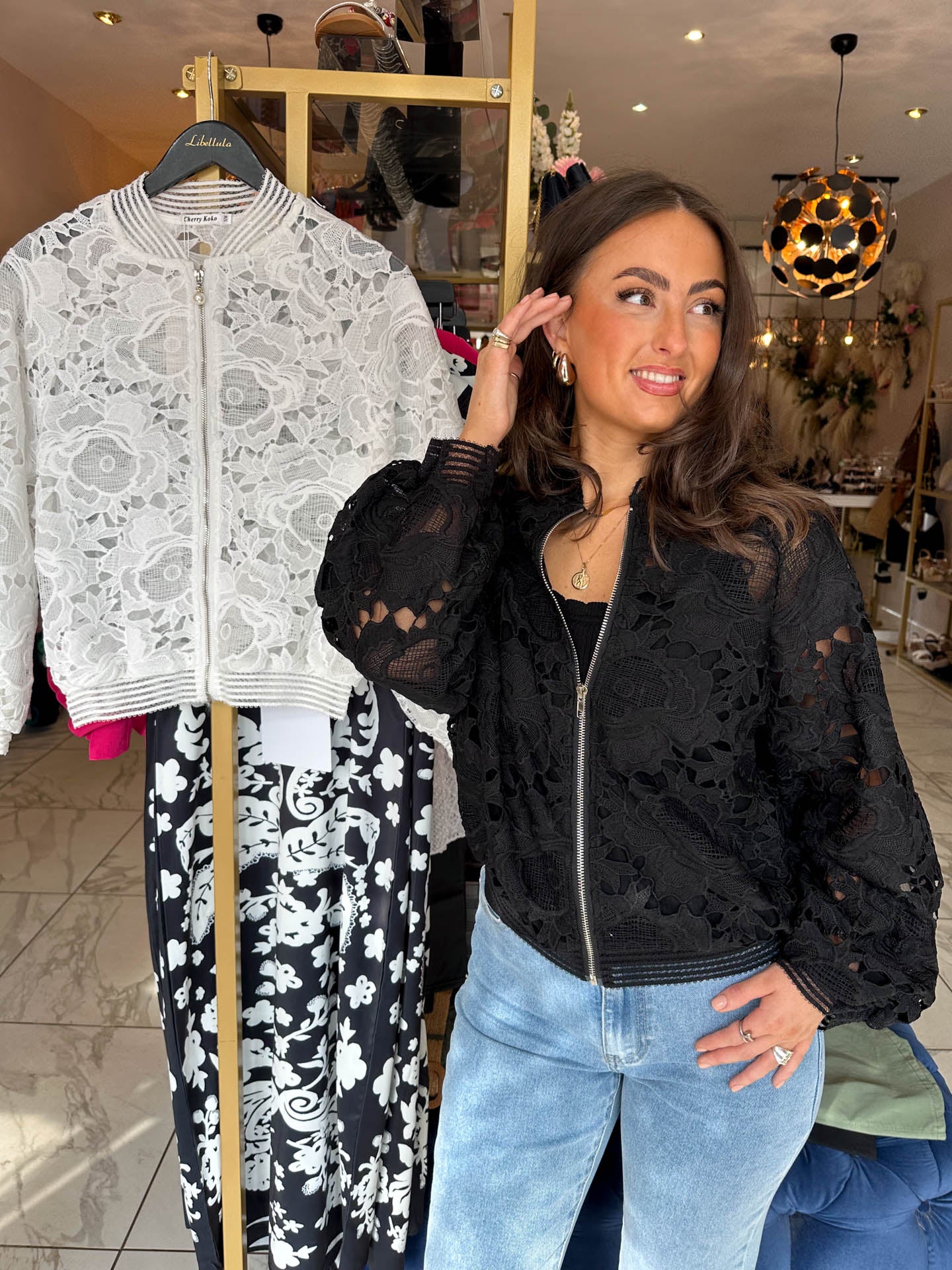 Our gorgeous Crystal is a perfect light weight bomber jacket! Featuring a floral lace pattern keeping you cool and stylish. Style with a basic t-shirt and jeans to complete the look!