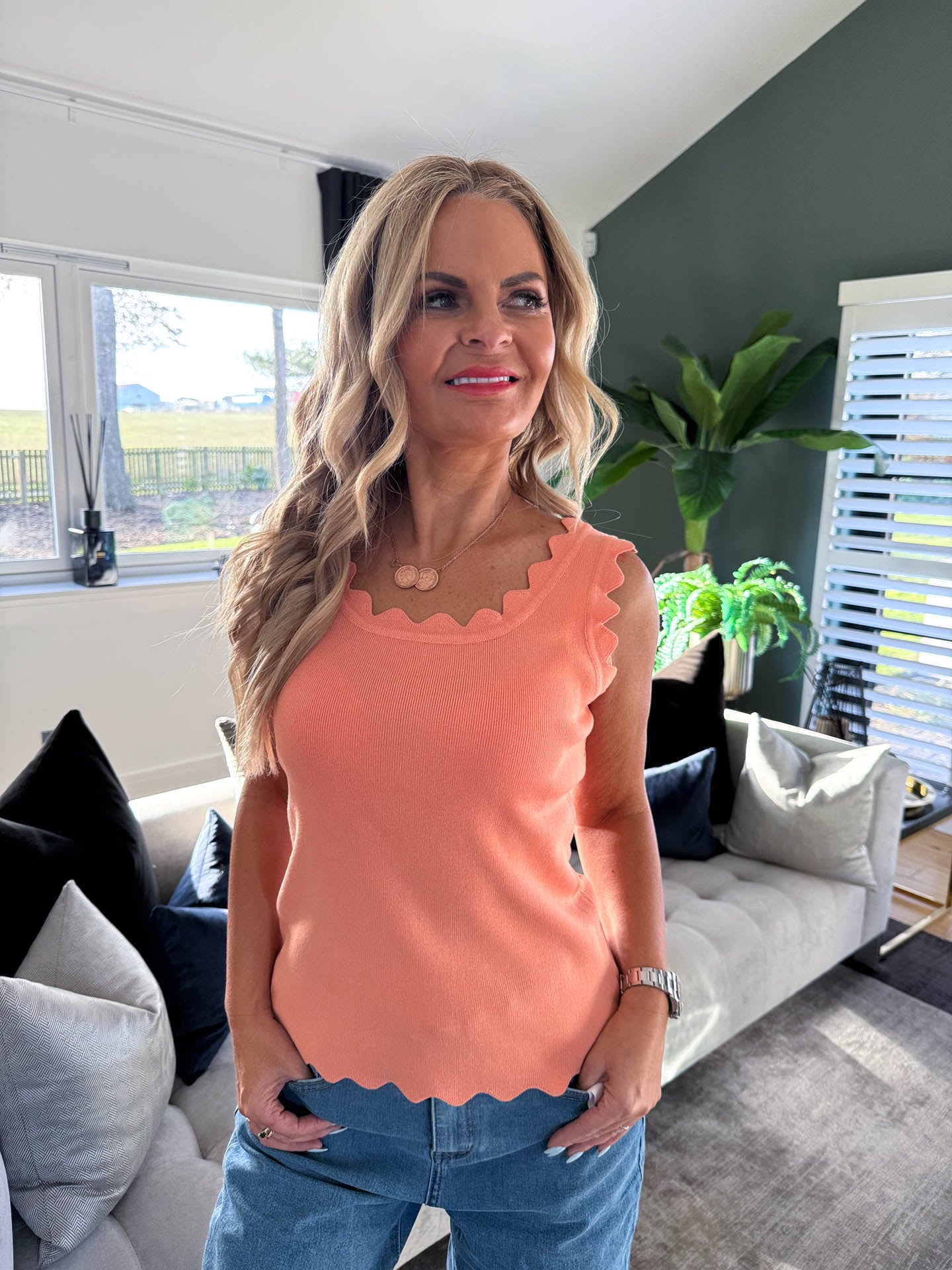 A classic basic with a twist. The Diana is a knitted vest with scallop edging, making this a more elevated basic for your wardrobe. Perfect for heading into AW25 when you need something a little warmer for layering.