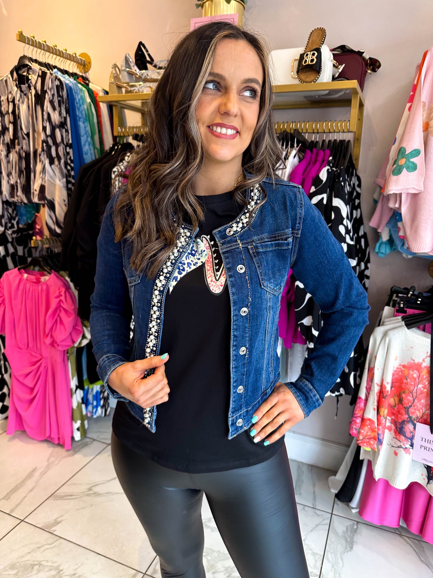All About Me - The perfect denim jacket has arrived to dress up your spring outfits. The Eliza has a scoop neck, pockets and stunning pearl details.