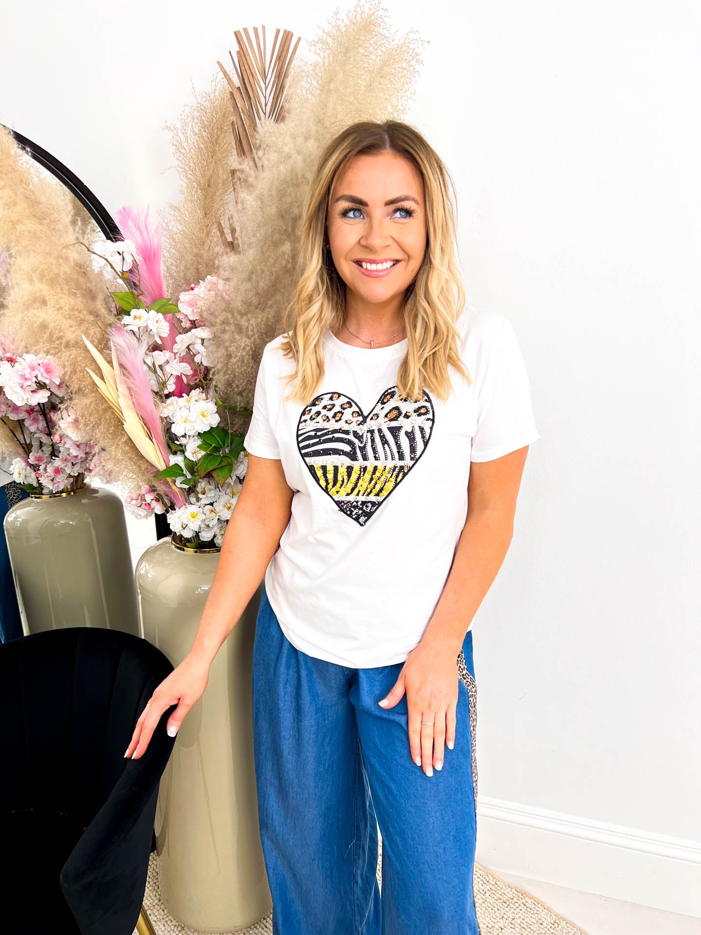 The Emily is the perfect everyday tee! With an animal print heart featuring diamantes and sequins, what's not to love! Pair with some blue jeans and trainers to complete this look.