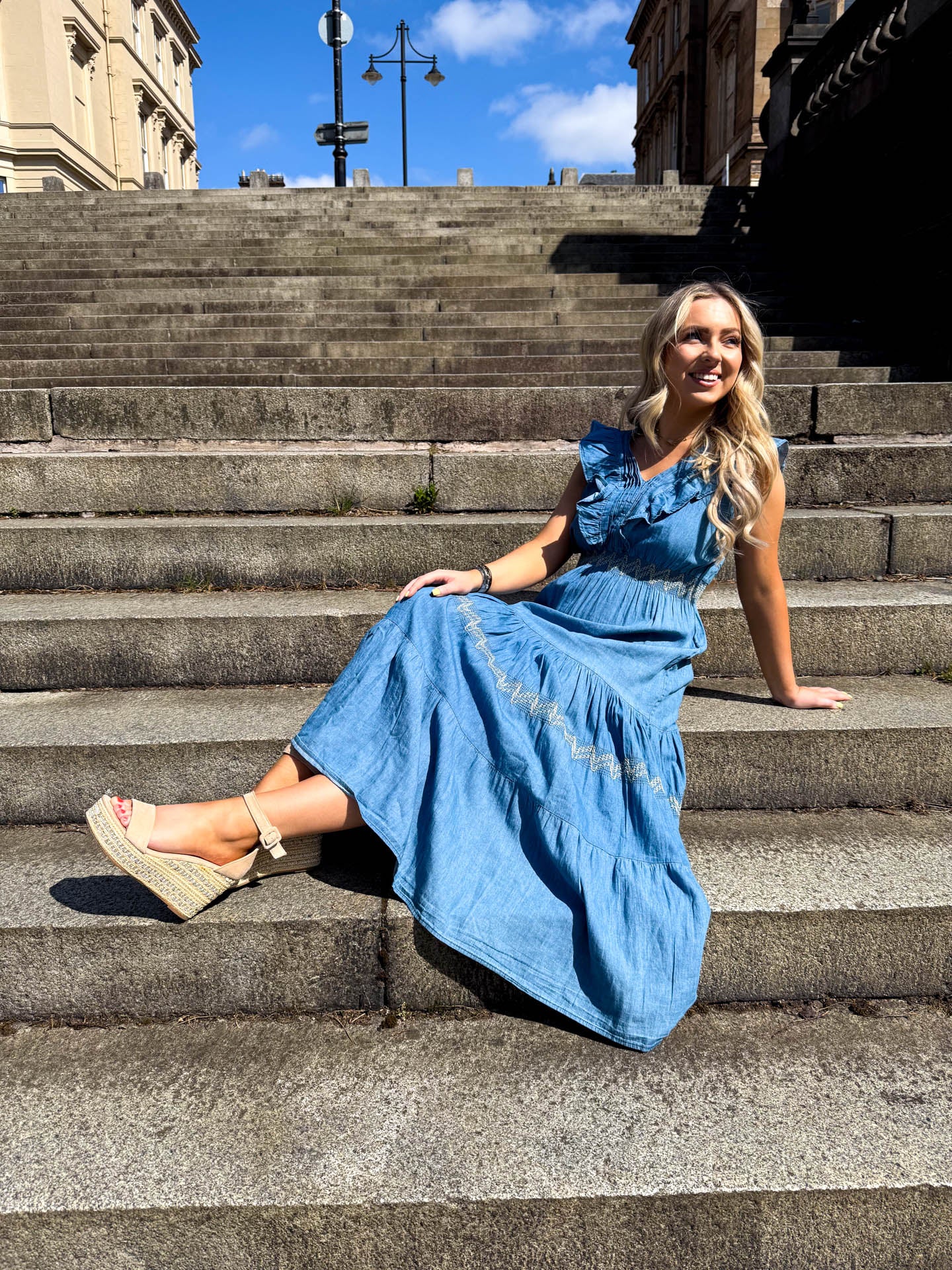 We LOVE our new Faye Frill Neck Denim Maxi Dress Paired with some wedges and a cute bag this will be your go-to for all your summer plans!