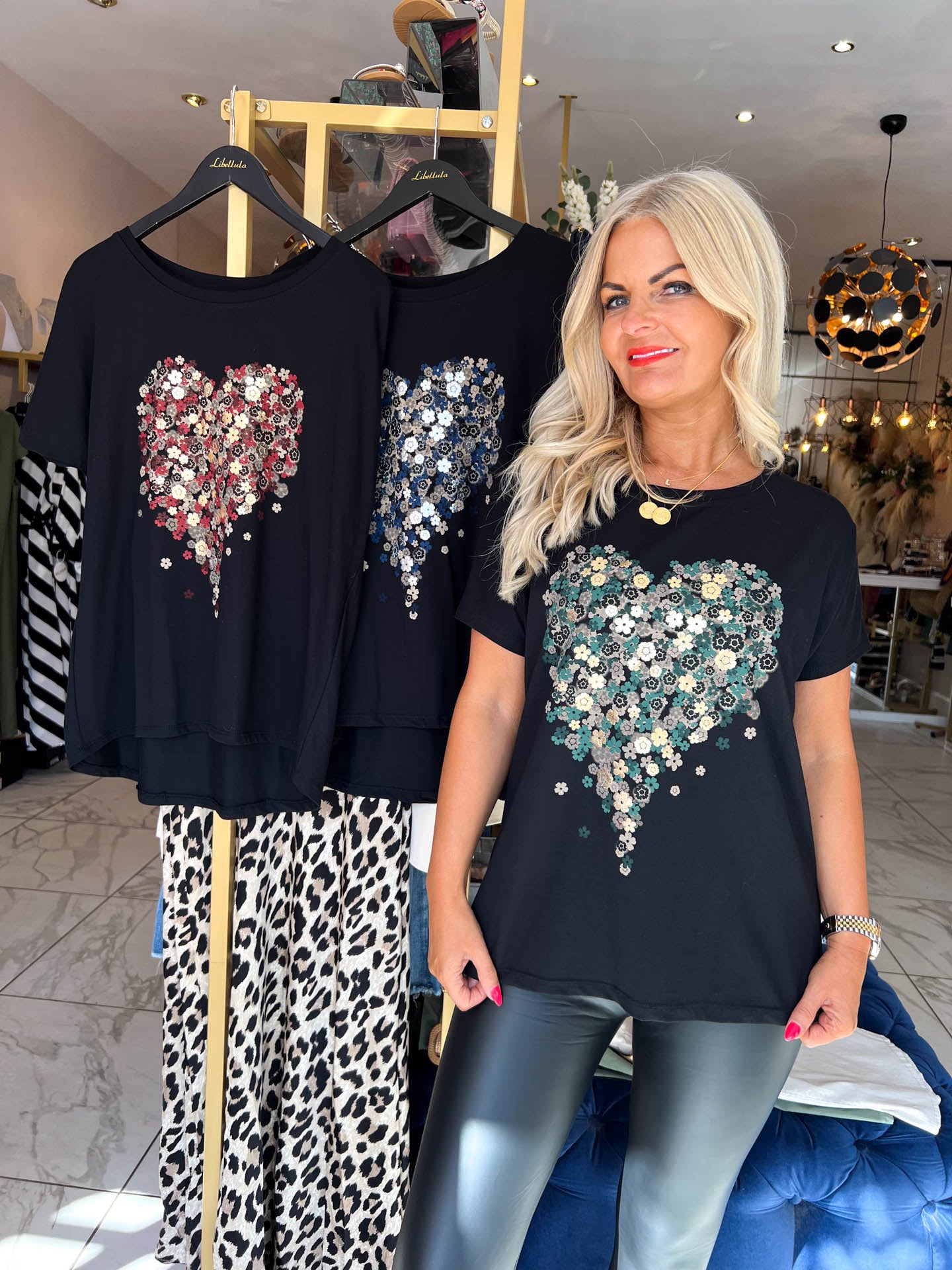 Our Jennifer t-shirt is so gorgeous for summer! Featuring a floral heart shaped design with metallic detailing. Style with our BECCA jogger trousers and trainers to complete the look!
