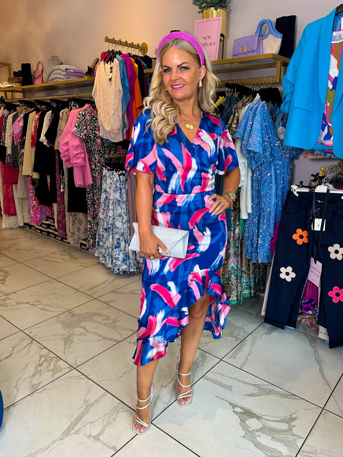 All About Me - How gorgeous is our Gianna midi dress?! Featuring a blue and pink abstract print, V-neckline and frill detailing. Pair with strappy heels and a clutch.