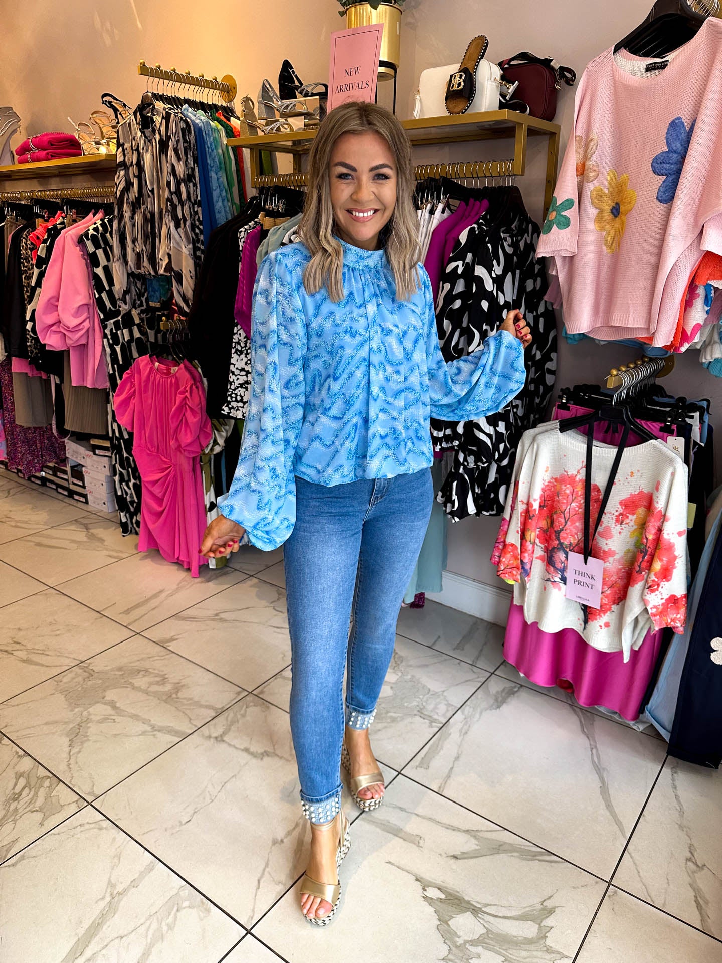 All About Me - The ophelia is our gorgeous new arrival. It features a high neck, flowy silhouette and a stunning blue wave design. Pair with our Harper white skinny jeans to complete the look.