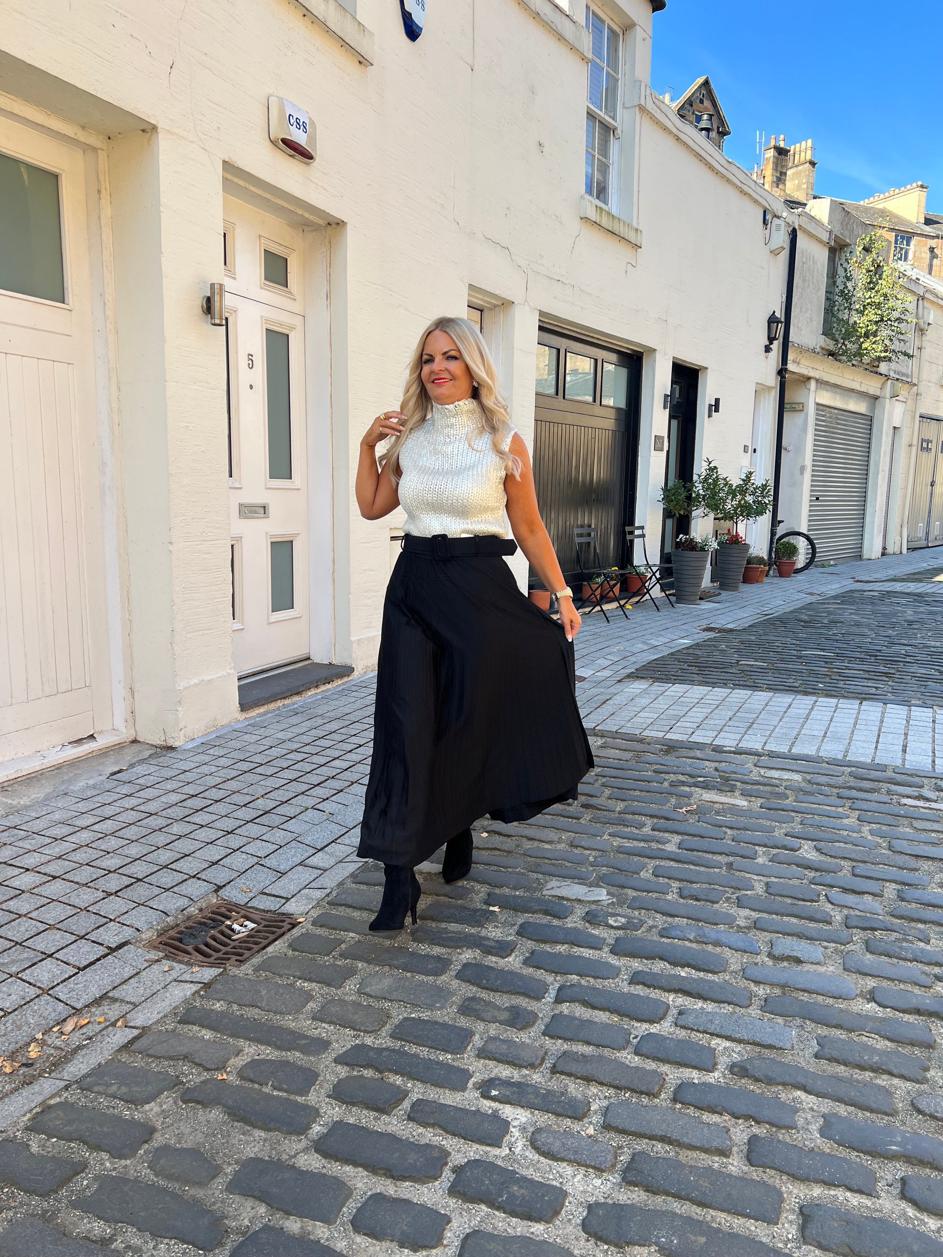 Our cosy Hayley knitted top features a high neck and silver metallic detailing over the cream wool. Style with a pair of leather leggings or jeans and boots to complete the look!