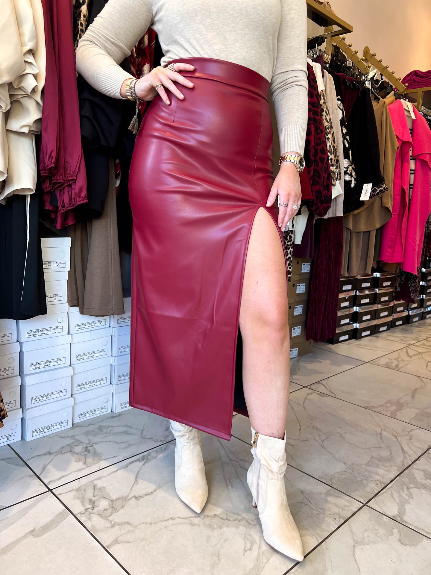 This is a wardrobe staple you will NOT want to miss! The JODI is a leather look midi skirt featuring a leg split creating a flattering silhouette. Why not pair this skirt with our KASIA knit and the RYLIE boot!