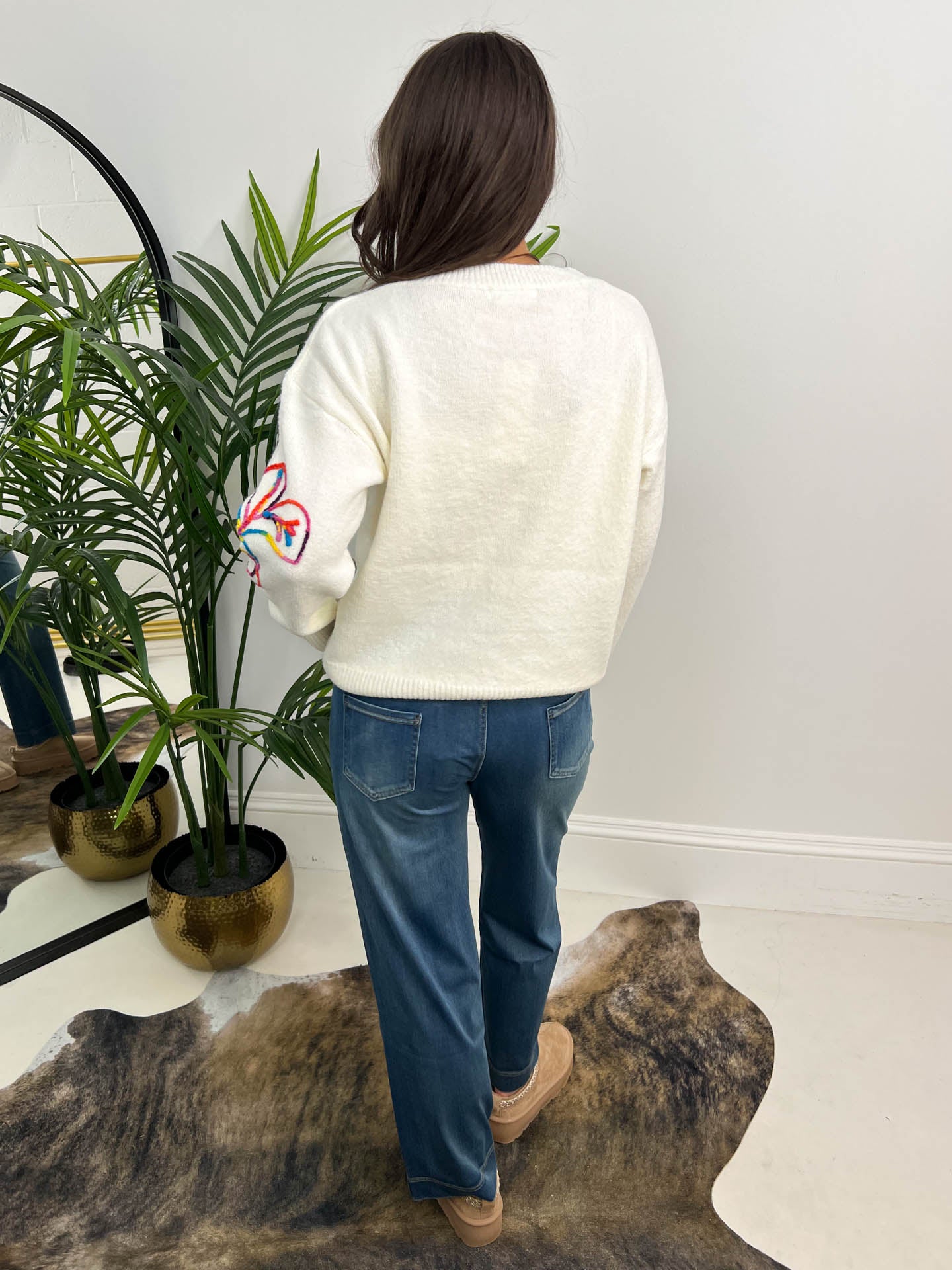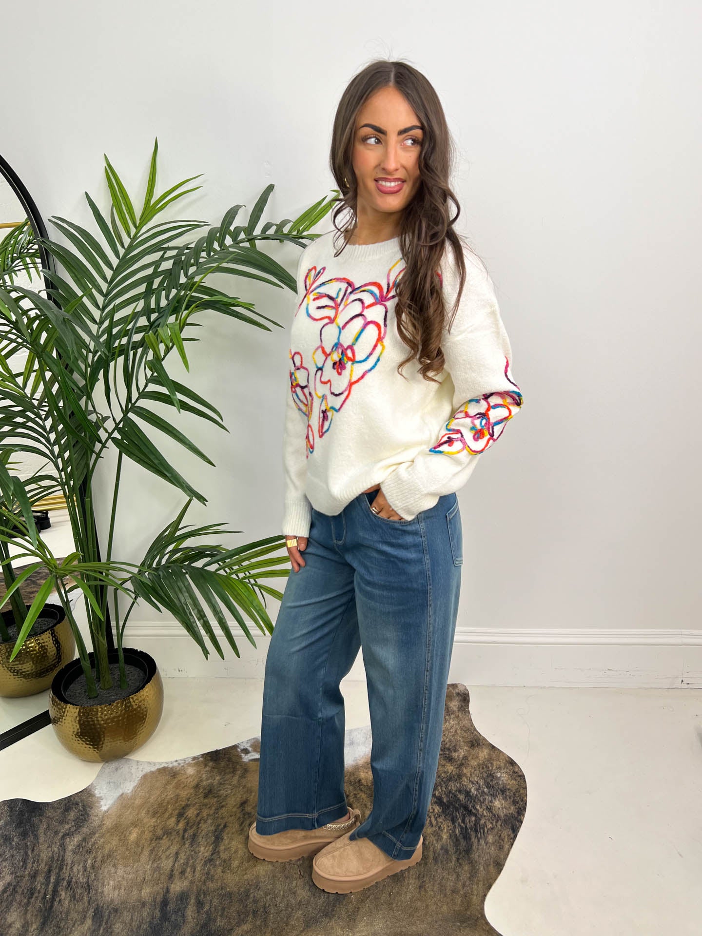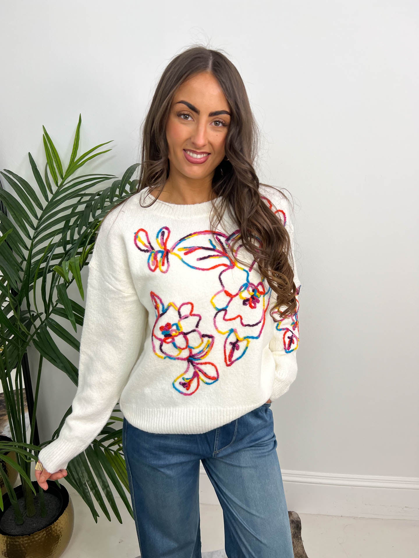 Introducing The Kat – a vibrant knit that's bursting with colour! This cute piece features a stunning floral thread design in an array of bright colours that'll brighten up any wardrobe. Perfect for adding a cheerful pop to your everyday look, whether you're layering it up or wearing it solo. Cosy, colourful, and utterly charming – because life's too short for boring knitwear!