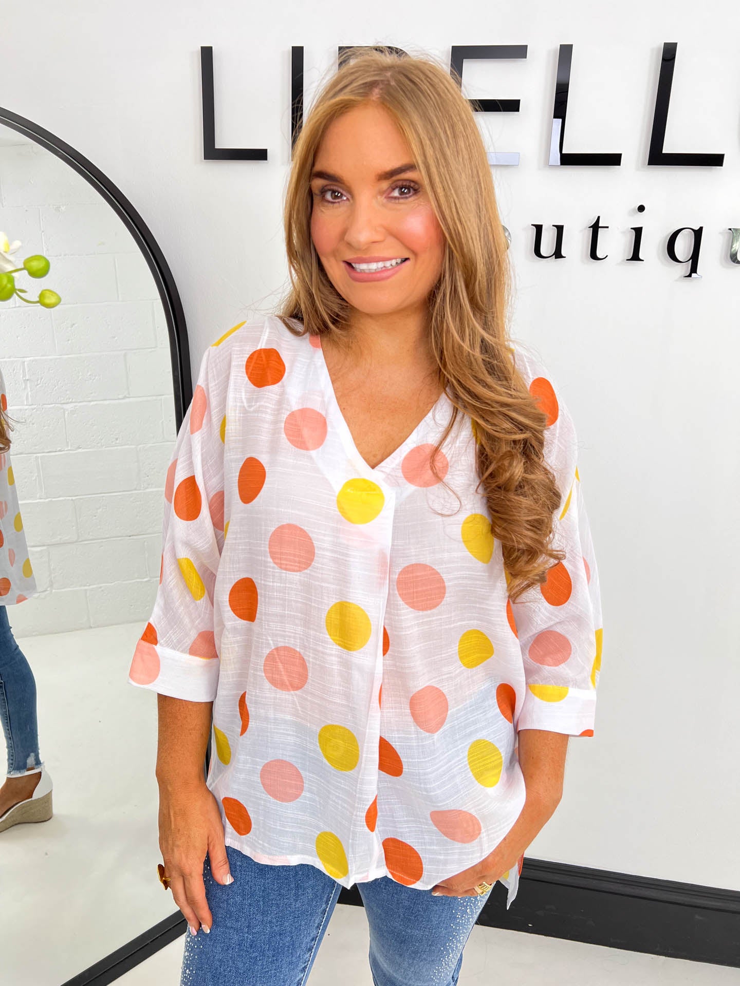 All About Me How cute is The Kelani!!! Featuring a colourful polka dot print it is a bright addition to your summer wardrobe. Available in green or yellow. Style this with The Mandy - Wide Leg Jeans and The Kara - Platform Wedges to complete the look.Size & Fit The Kelani is available in UK sizes 8-16. For reference our model is 5,3 wears a 8-10. Here she is wearing an eight.Looking After Me Wash at 30. Iron on low heat. Do not bleach or tumble dry.