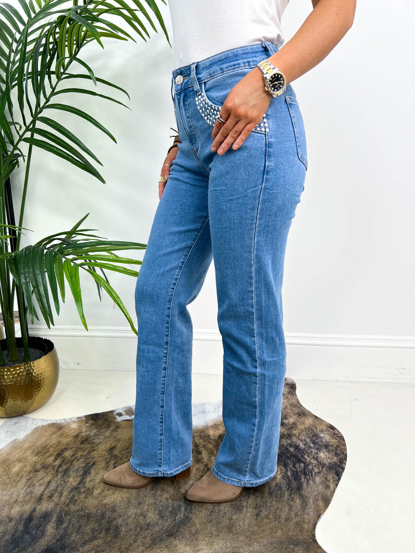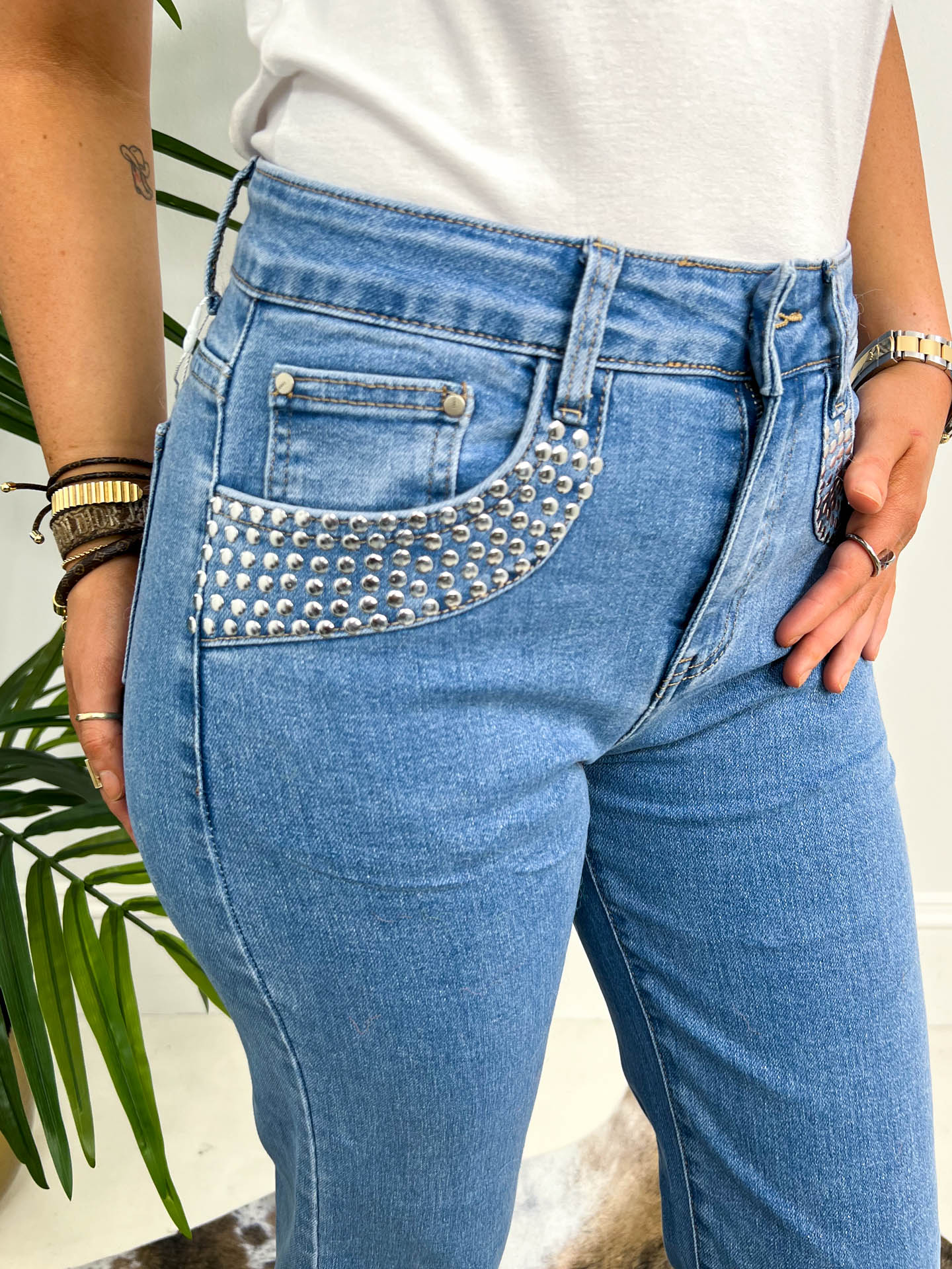 The Kelsie jeans are your new denim obsession. These wide-leg beauties feature eye-catching studded pockets that add serious edge to your everyday look. Crafted for comfort and style, they're perfect for dressing up or down—pair them with trainers for casual vibes or heels for a night out. The relaxed fit flatters every frame, while the statement pockets ensure you'll turn heads. A wardrobe essential that proves denim can be both fun and fabulous.
