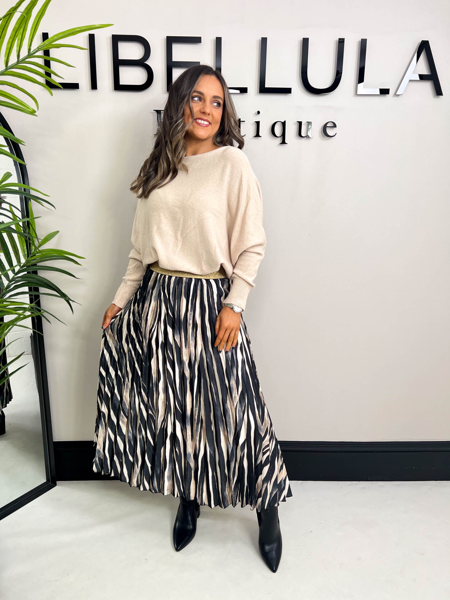 The Laura is our classic pleated maxi skirt, and this print is perfect for all those neutral colourway lovers. A simple yet gorgeous wavy print that pairs perfectly with The Ophelia in beige or black for a classic, chic look for a dinner or even work event. We adore this new season prints of a classic favourite.