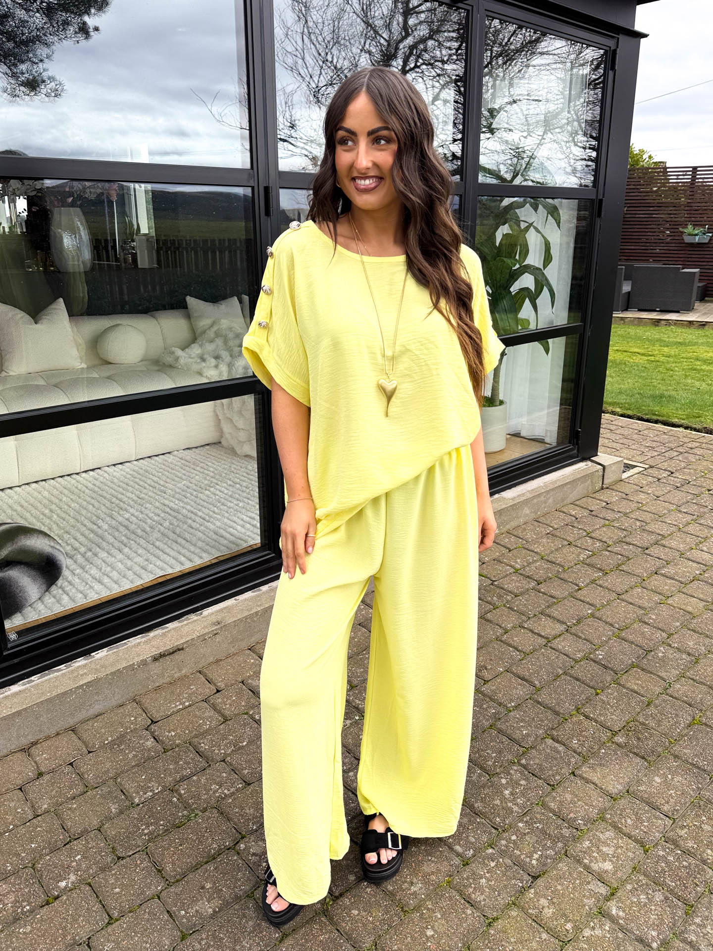 The Lexis is your go-to two-piece for effortless spring-summer style. This playful set pairs a crisp t-shirt adorned with eye-catching gold button detailing on the shoulders with lightweight straight-leg trousers. Choose from eleven gorgeous colours to match your mood and wardrobe. The Lexis is perfect for your summer holidays, paired perfectly with sandals or trainers.