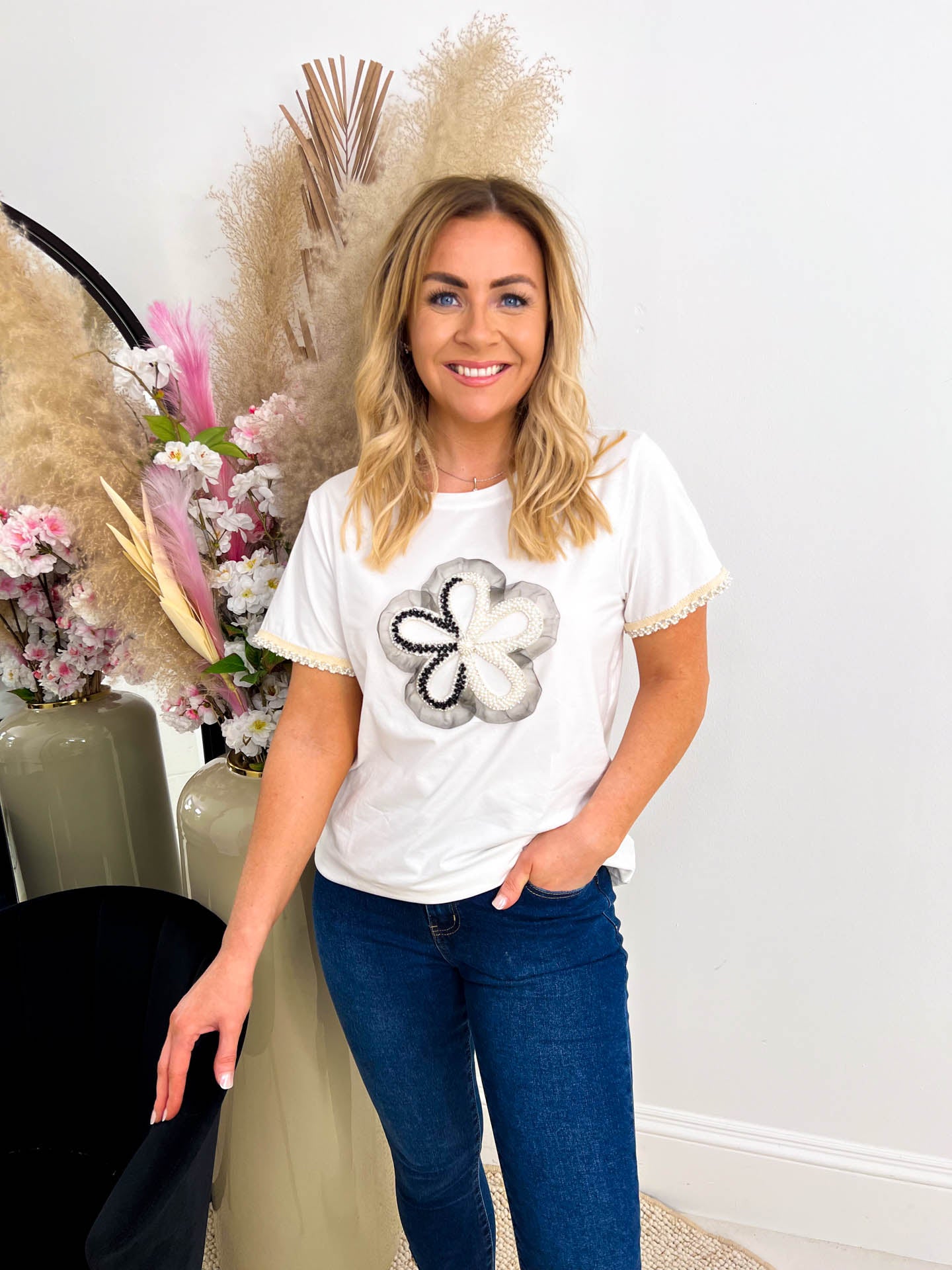How cute is our Liberty Tee?! The Liberty features a black and white pearl flower and mesh detailing on the front, along with pearl lined sleeves. Style with your favourite pair of blue jeans for the perfect everyday look.