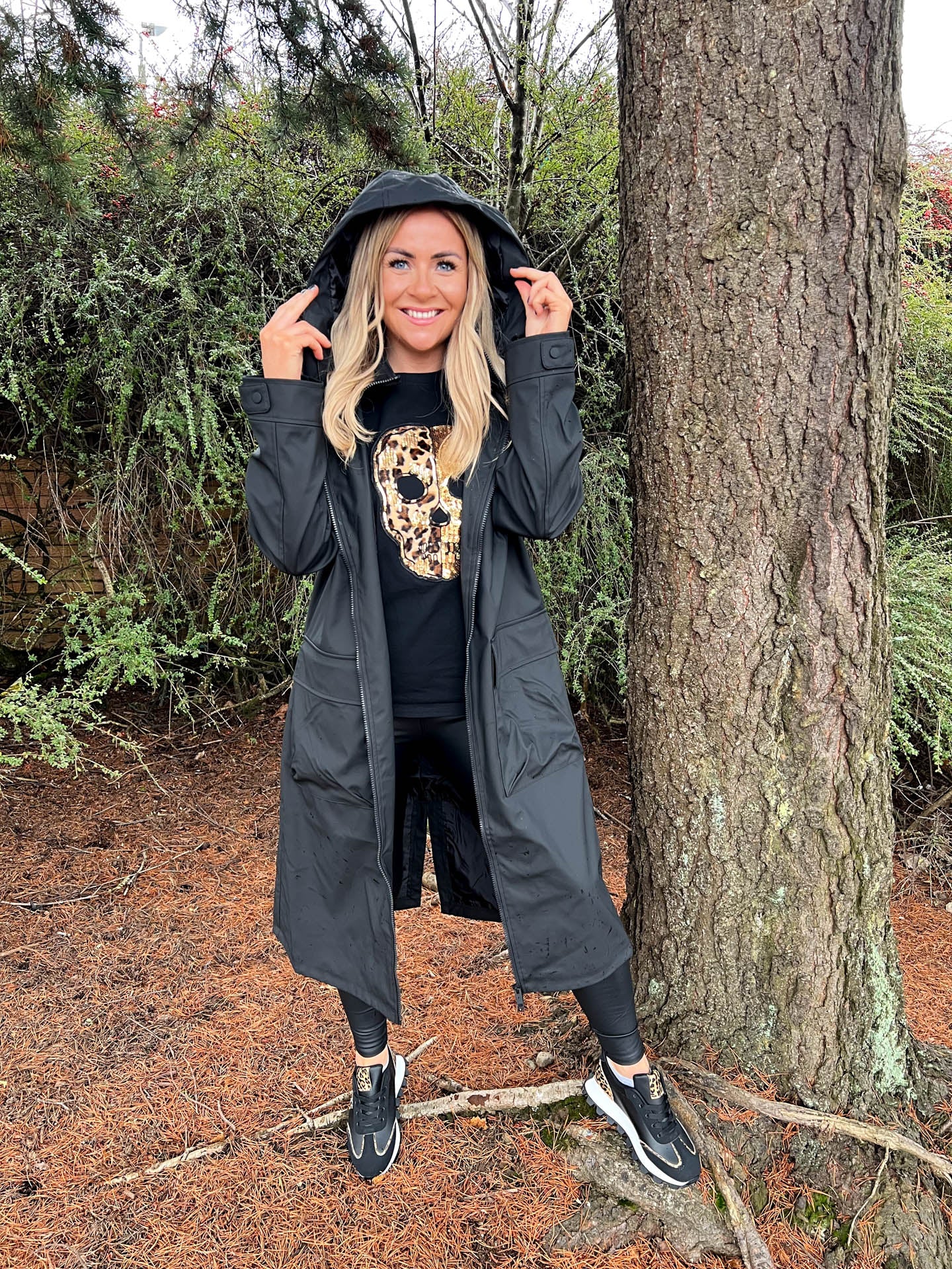 The Lilah Rain Coat is perfect for those rainy days, keeping you dry and looking cute! This jacket Features 2 front pockets, a button up hood and full length zip.