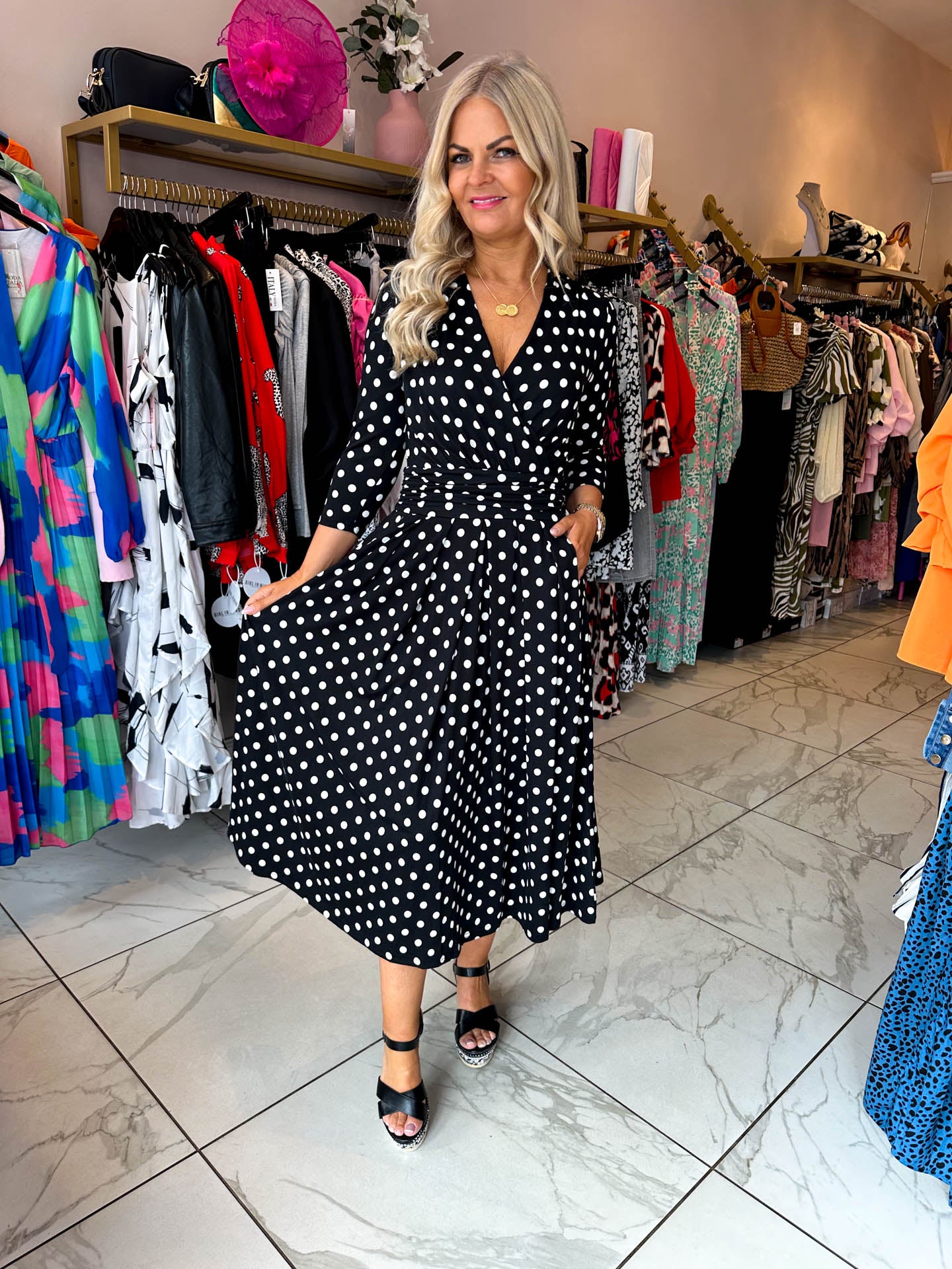 All About Me - The Lois is the perfect going out dress. Featuring a polka dot print, wrap front and long sleeves. Pair with some black strappy heels and handbag for a classy, stylish look.