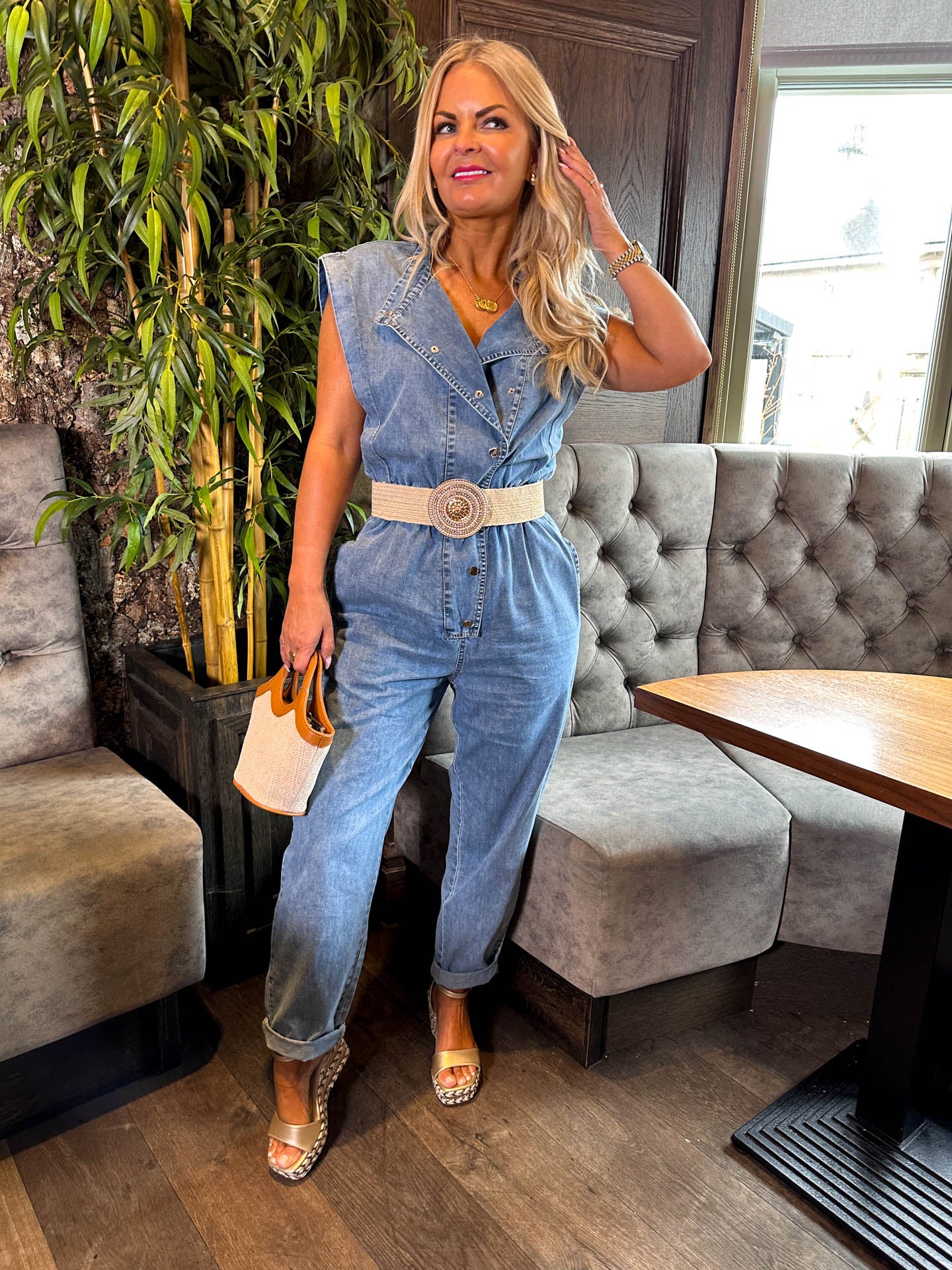 All About Me - This jumpsuit is on trend and stylish. The Gloria is a super comfortable jumpsuit with a cinched waist detail, buttons up, and is sleeveless - making it a great choice for spring!