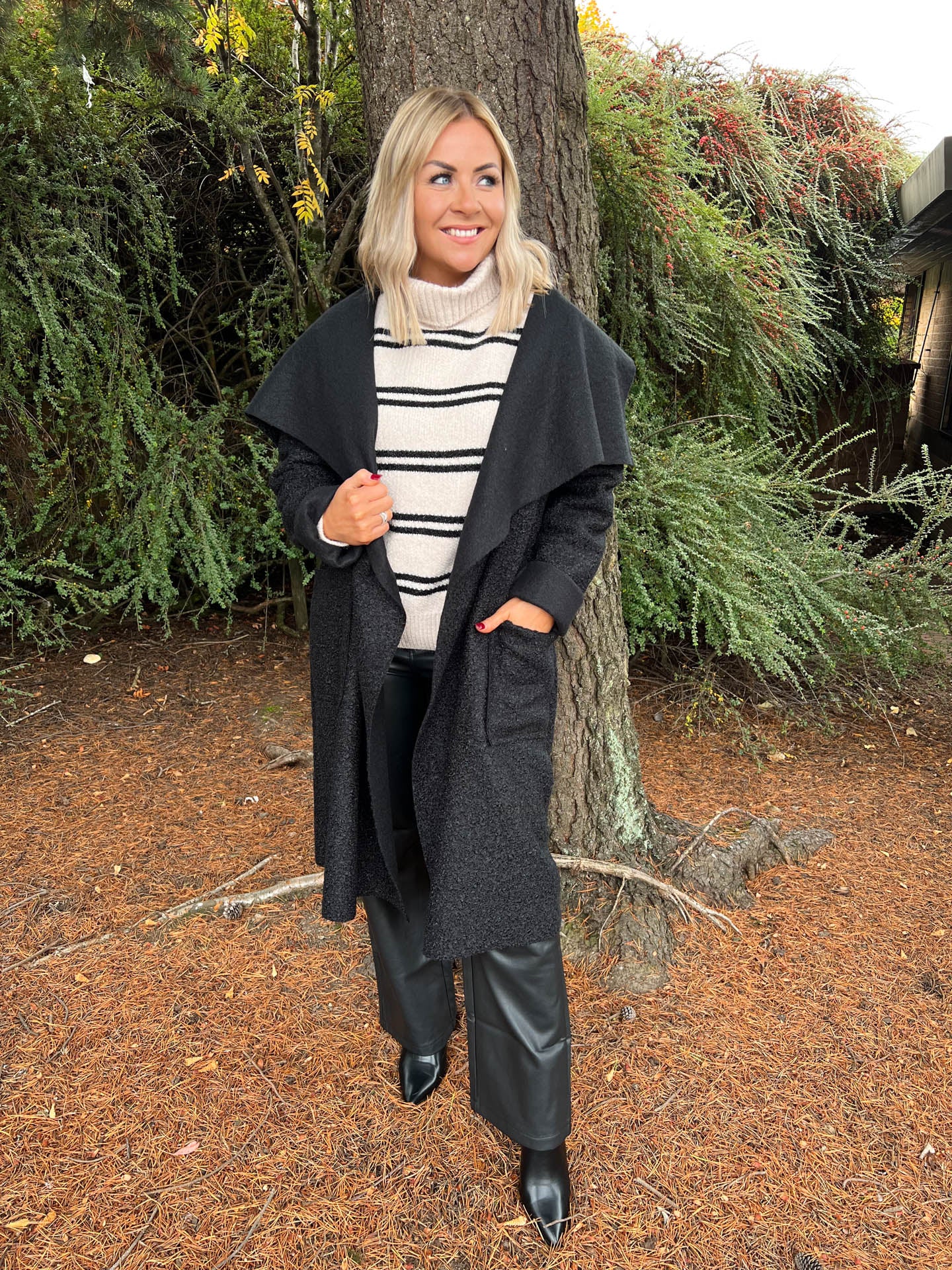 This stunning knit features cuffed sleeves, two large pockets and could be worn as a cardigan or a jacket keeping you cosy this A/W ! Style with leather leggings, a basic black t-shirt and a pair of boots to complete the look !