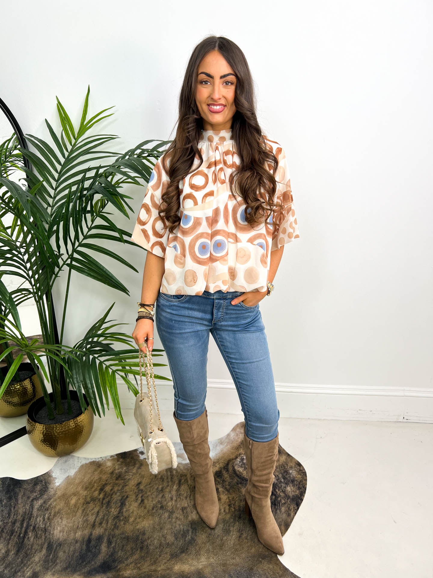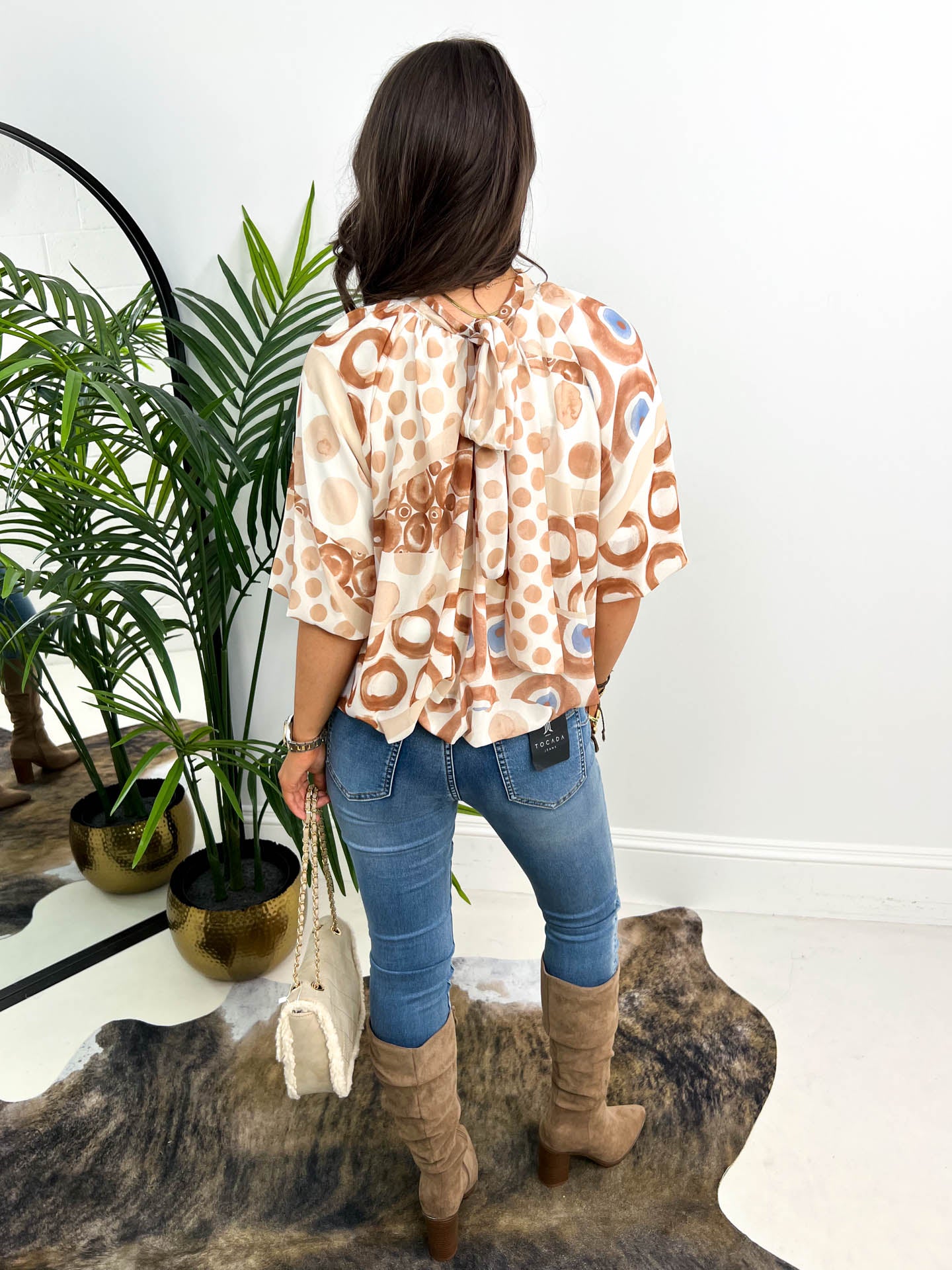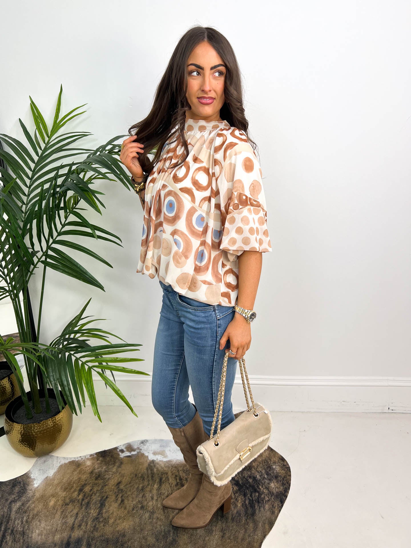 Our stunning OPHELIA blouse has had a little makeover and now comes in this cute, short sleeve style. We love the beautiful peacock print design, that comes in a blue or beige version. It has a tie neck, which makes this easy to adjust at the neck. Styling the Ophelia with some straight leg jeans and boots is an easy yet chic look if you're heading out for lunch with the girls.