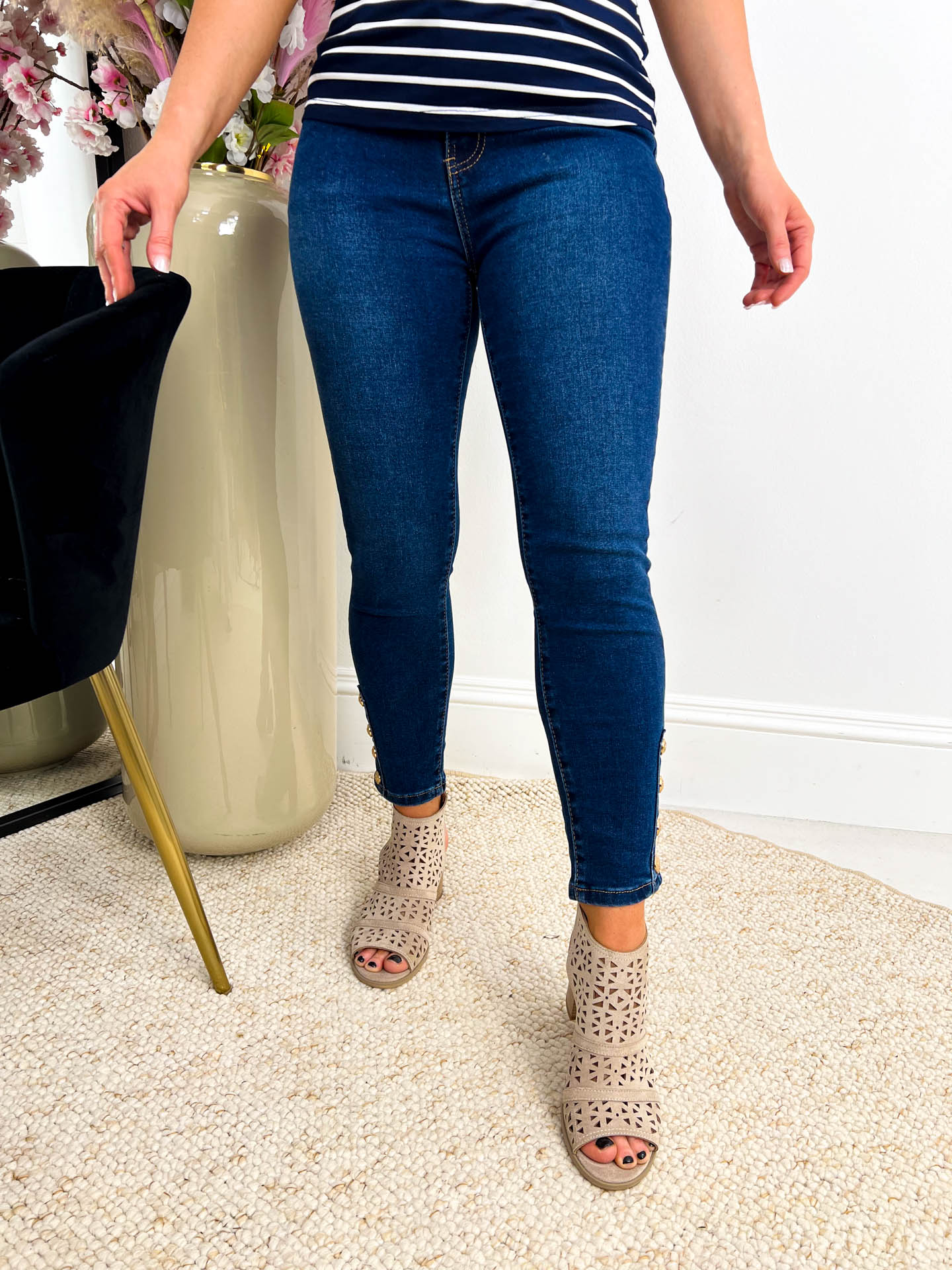 Our Phoebe Jeans are a gorgeous dark wash denim jean, with gold button detailing.