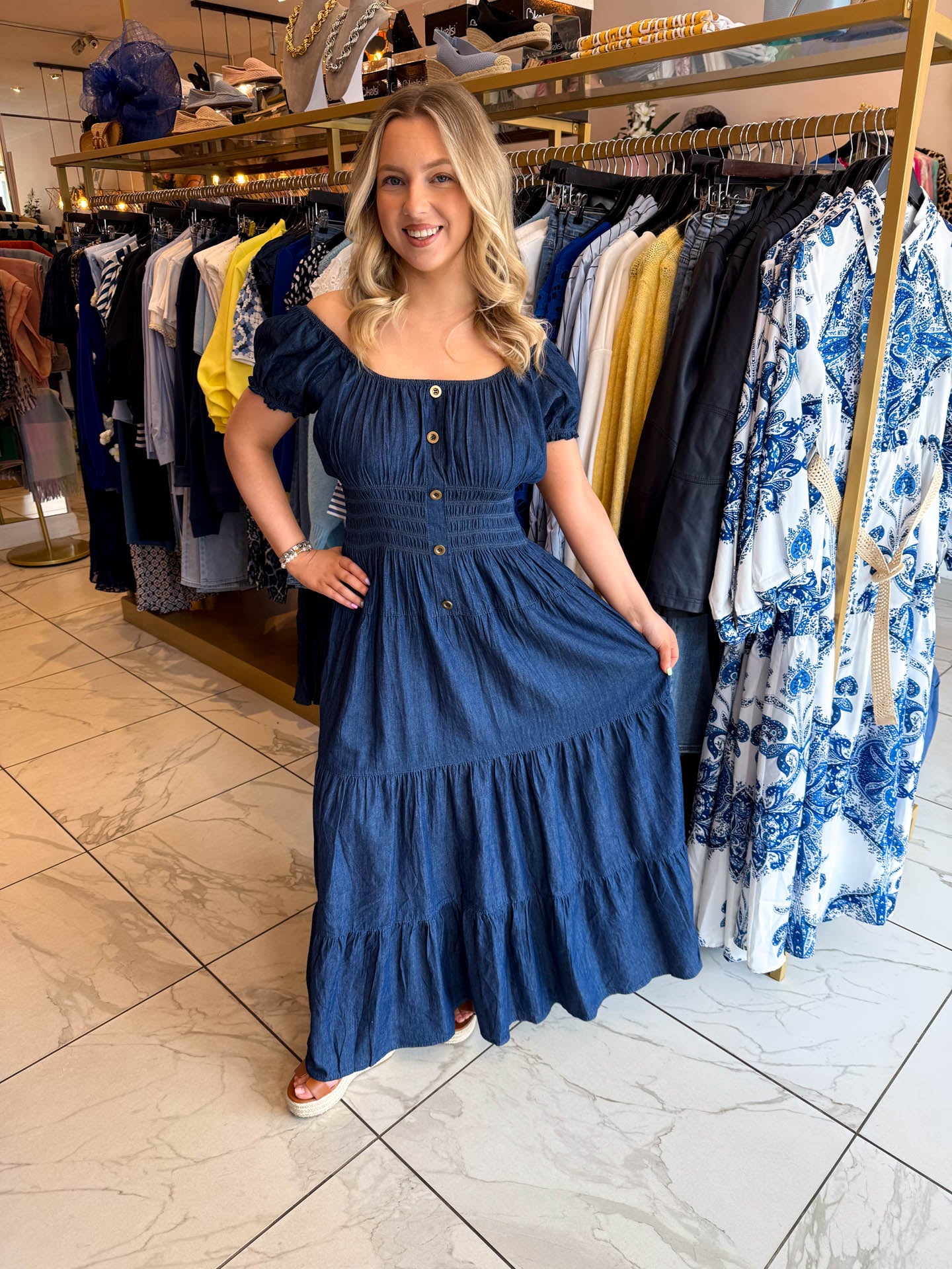 The Piper is your new favourite, denim, midi dress. We love that you can wear this both on or off the shoulder, and the cute button detail just adds to this dress. The Kathy goes great with the Lara wedges for a dressier/holiday look, but you can also wear it more casual with the Paisley trainers for the perfect lunch look.