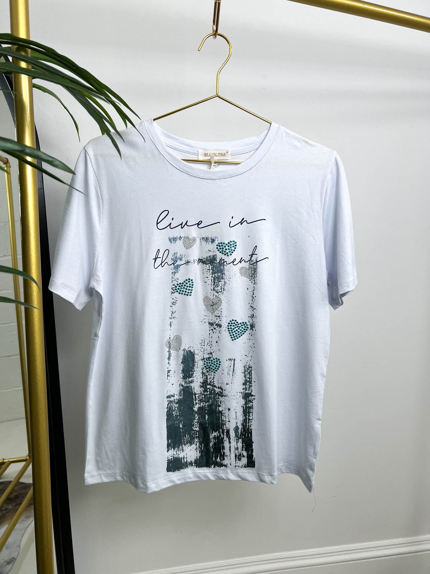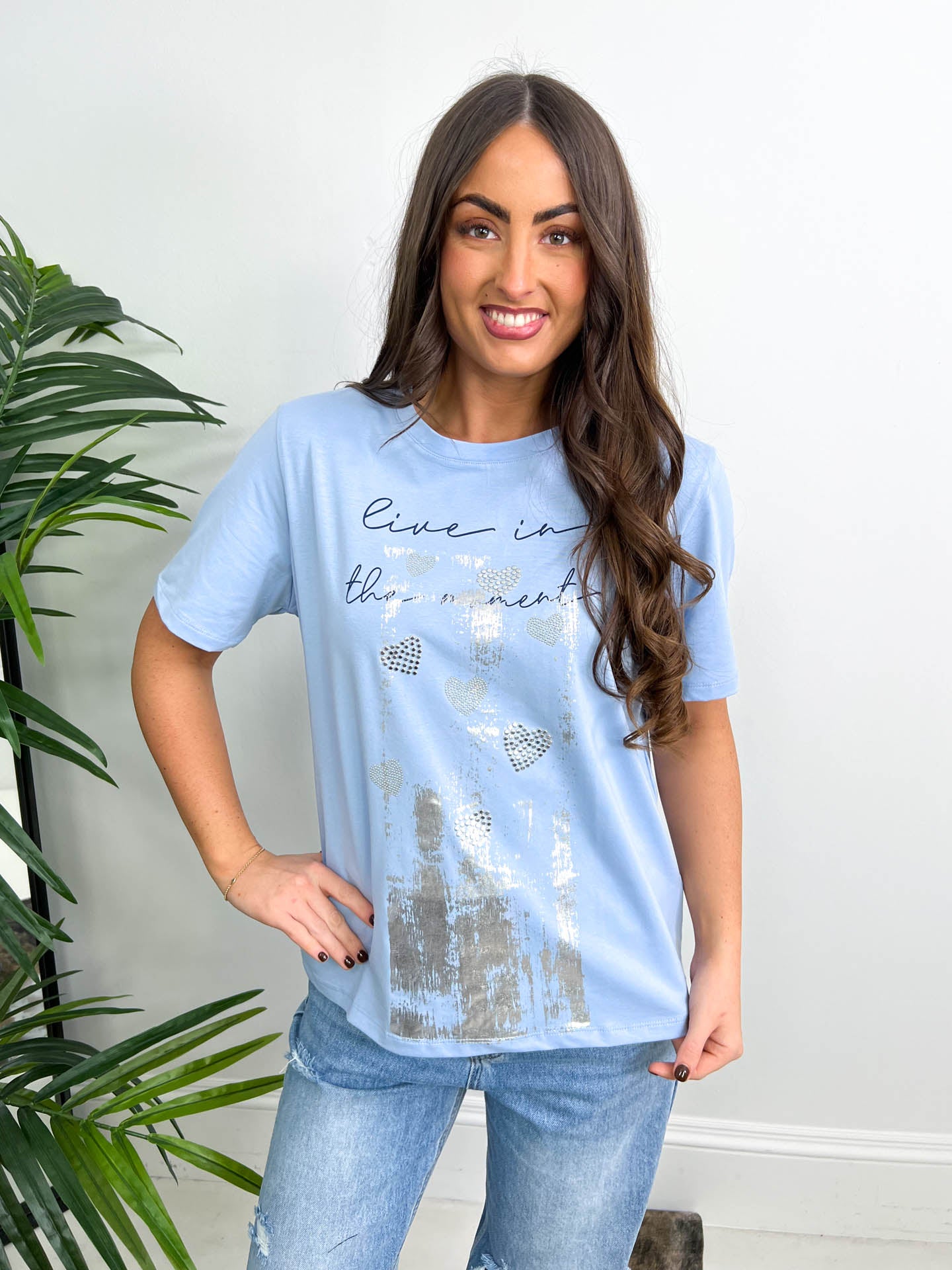 Embrace the moment in style with The Riley, a vibrant short sleeve tee that celebrates living life to the fullest. Featuring a 'Live in the Moment' graphic paired with embellished hearts, this playful design brings positivity to your everyday wardrobe. Available in five gorgeous colours, there's a shade to match every mood and personality. Perfect for those who believe in making memories and enjoying the present.