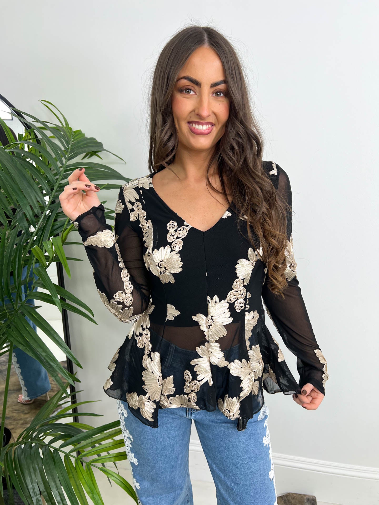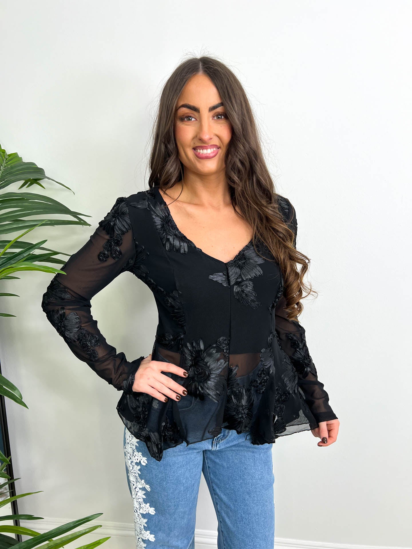 The Rosa - Satin Floral Detail Mesh Blouse Elevate your everyday style with this enchanting mesh blouse, where delicate florals meet modern sophistication. The sheer mesh fabric creates an effortlessly romantic silhouette, while satin floral details add a touch of luxe dimension and visual interest. Dress it up with tailored trousers or down with your favourite denim for versatile styling that works season after season.