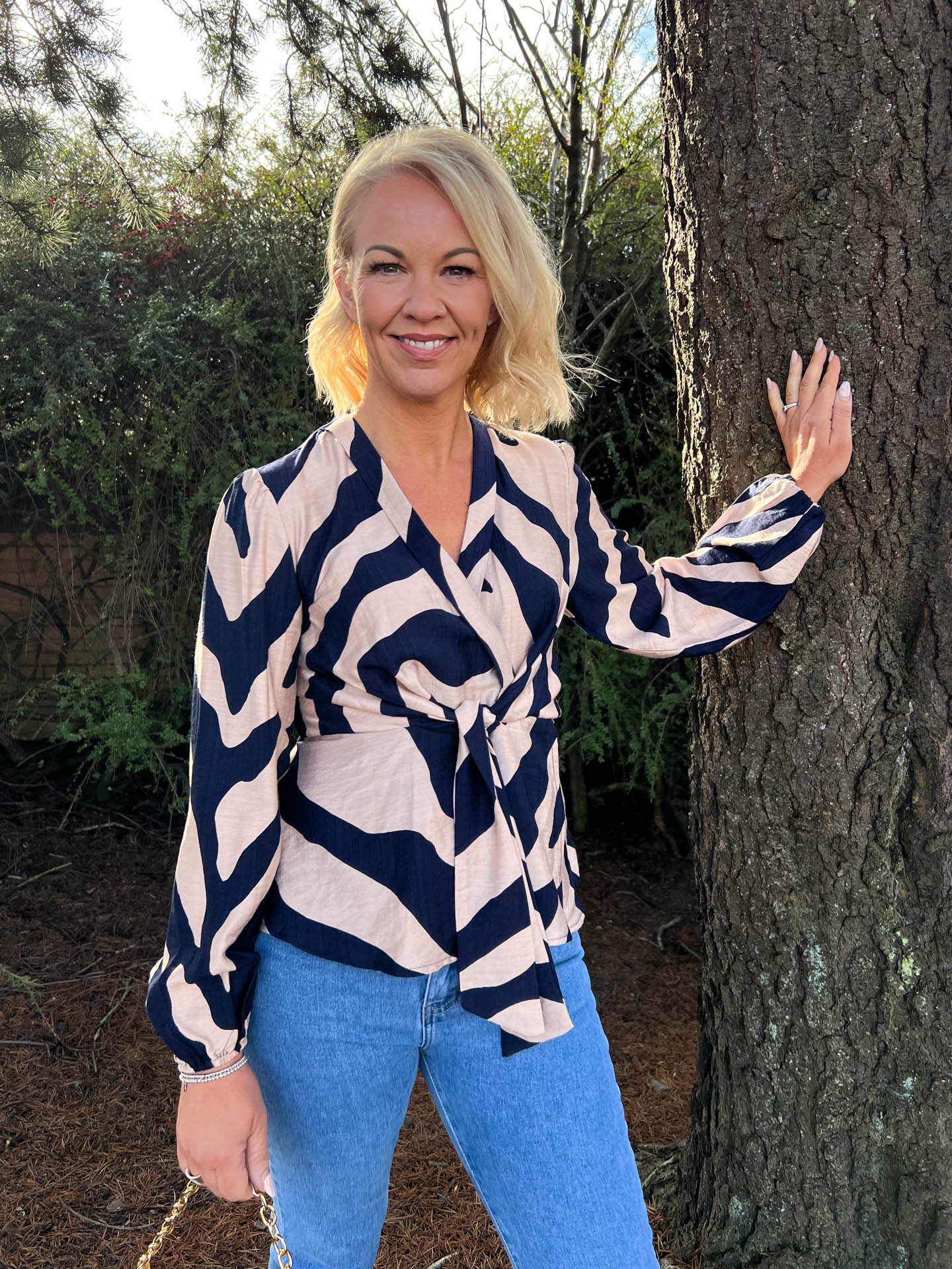 Ok we are loving The Sara wrap top! The navy and beige animal print comes in this linen like material which makes it comfy and breathable. We LOVE to wear our with The Phoebe button jeans and The Naomi heels for the perfect 'going out for dinner' kinda look!