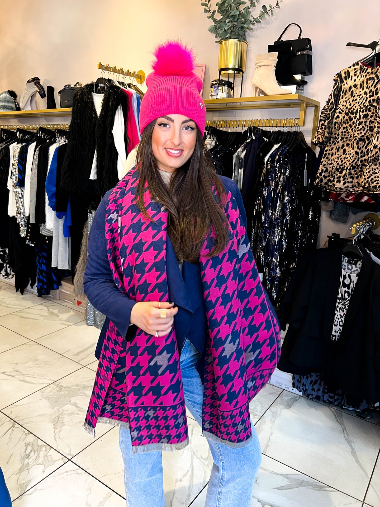 Our stunning Sara scarf features a houndstooth pattern and frill detailing along the edges ! Available in Black, Pink and Navy.