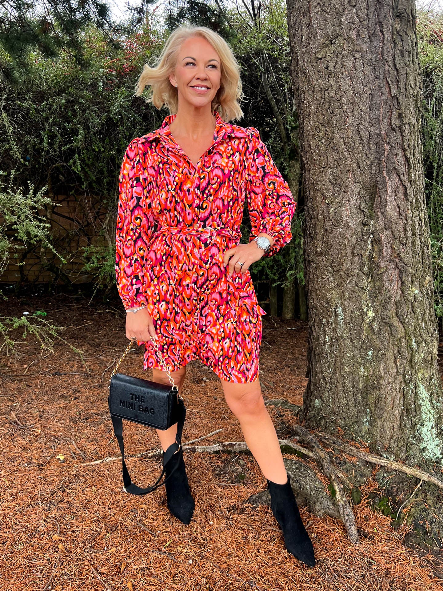 We just LOVE a shirt dress and we know you love them too! The Sierra has a stunning, colourful, abstract print that catches eye and will brighten up your wardrobe ready for SS25. It has a swing style skirt, and fabric waist belt which cinches un the waist and creates shape. Styled with our Rylie boots and a leather jacket, ready for a dinner date or drinks with the girls.