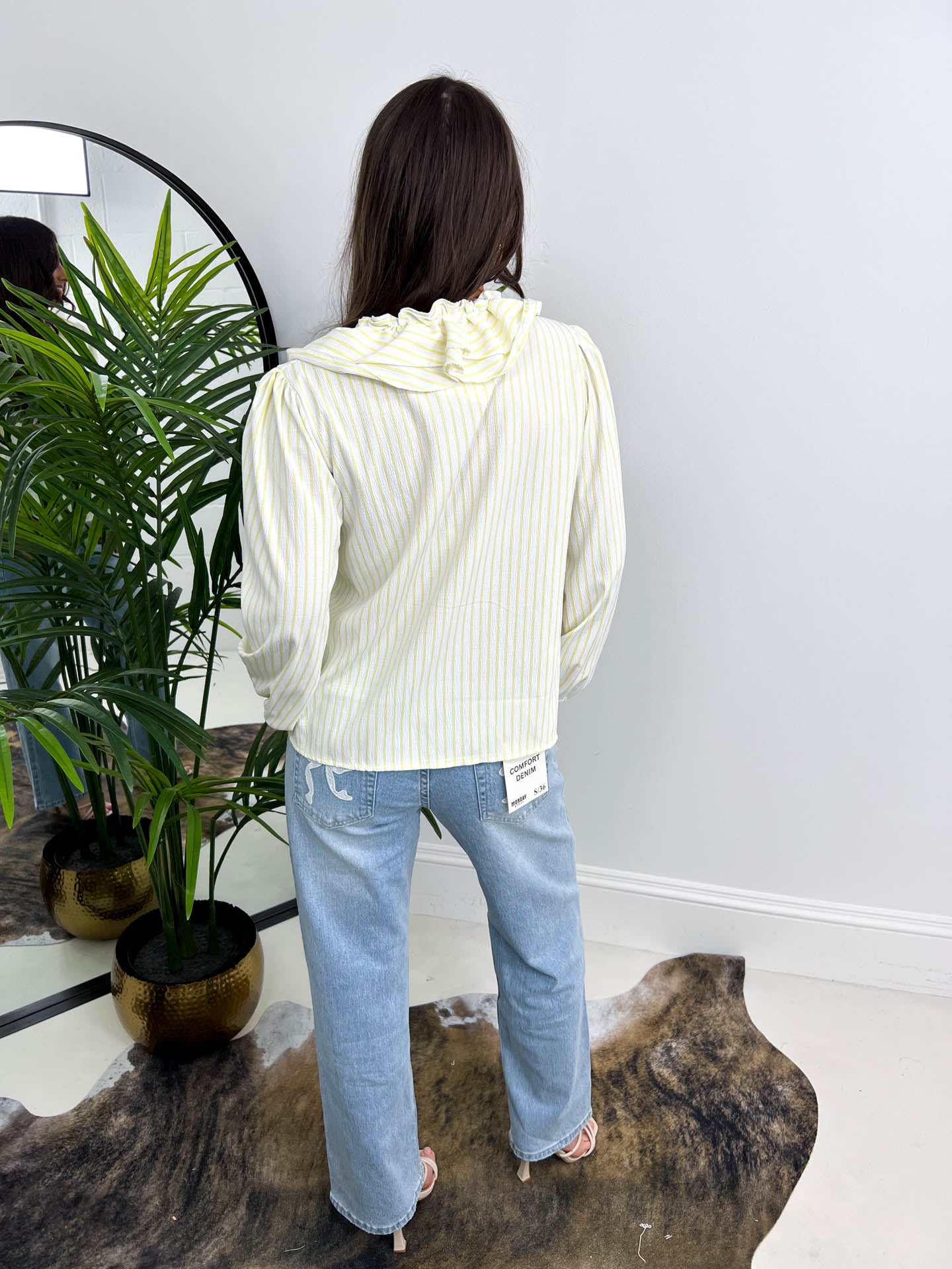 Meet The Sophia – a blouse that's bursting with personality! This charming long sleeve style showcases a frilly collar and adorable tie bow that instantly elevate your everyday wardrobe. The crisp white fabric with playful stripes provides the perfect canvas, while the gorgeous mint and yellow options let you express your vibrant side. Whether you're heading to brunch, the office, or a weekend adventure, this blouse brings joy and flair to every moment. It's the kind of piece that makes getting dressed feel like fun – pair it with your favourite bottoms and watch the compliments roll in!