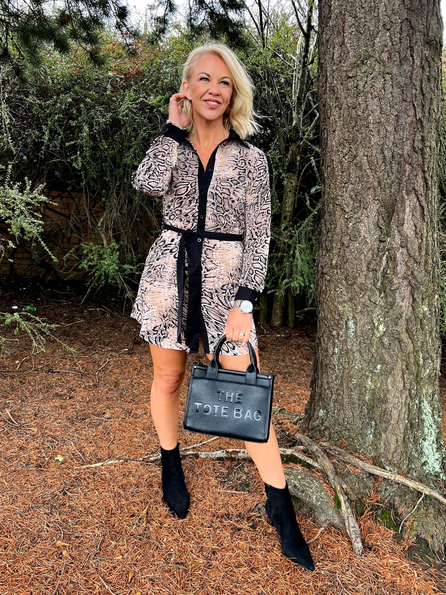 We just LOVE a shirt dress and we know you love them too! The Tait is a snake print, mini, shirt dress with fabric waist belt. We styled with our Rylie boots, shopper bag and a leather jacket for a date night with your girls. The Tait can also be styled over our Farrah leggings for a tunic style blouse.