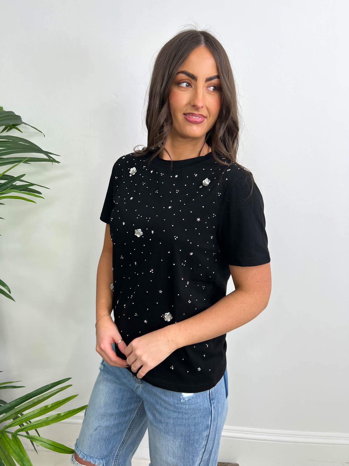 Sparkle and bloom in The Tara, a short-sleeve tee that brings the glam. Adorned with shimmering diamante and delicate floral embellishments across the front, this playful piece transforms an everyday essential into something special. Available in white or classic black, it's the perfect way to add a touch of shimmer to your casual wardrobe.