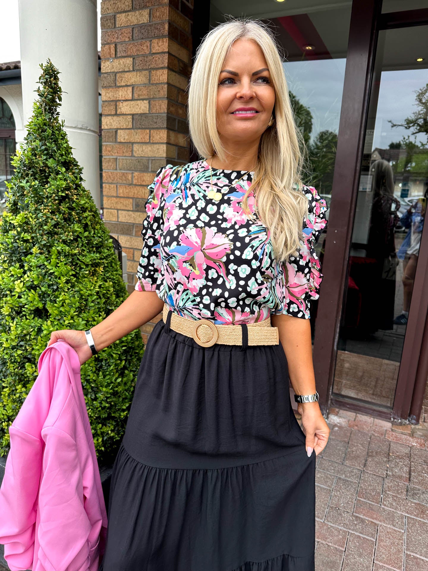 All About Me - Our Tasmin top is the perfect addition to your spring, going out wardrobe. Featuring a high neckline, frilled sleeves, and a gorgeous floral design that features a lovely pop of colour throughout. Pair with our Kate Jeans.