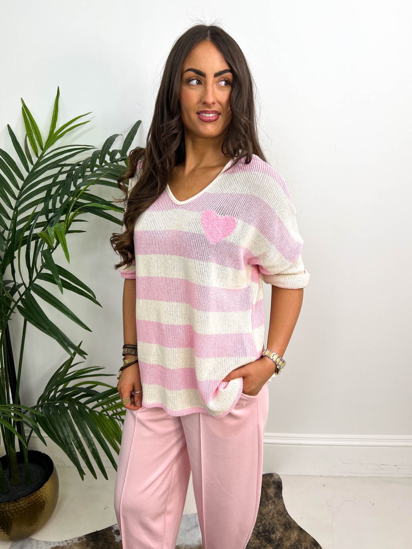 The Terry is a mesh, knit style material with 3D heart detail and striped design. This is a relaxed knit that you can roll up or down the sleeves depending on the style you like. If we were styling the Terry we would opt for the pink or blue Aria joggers to match the stripe and go for a super casual yet cute, day to day look.